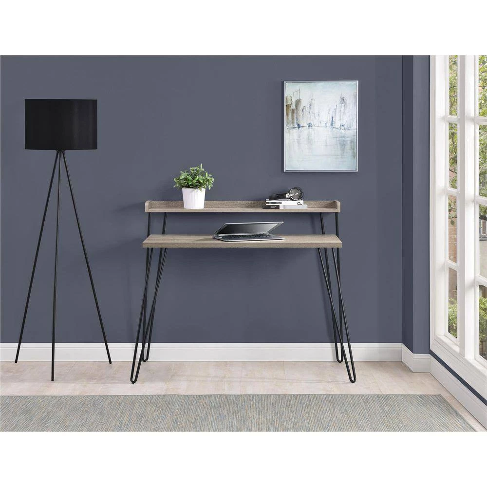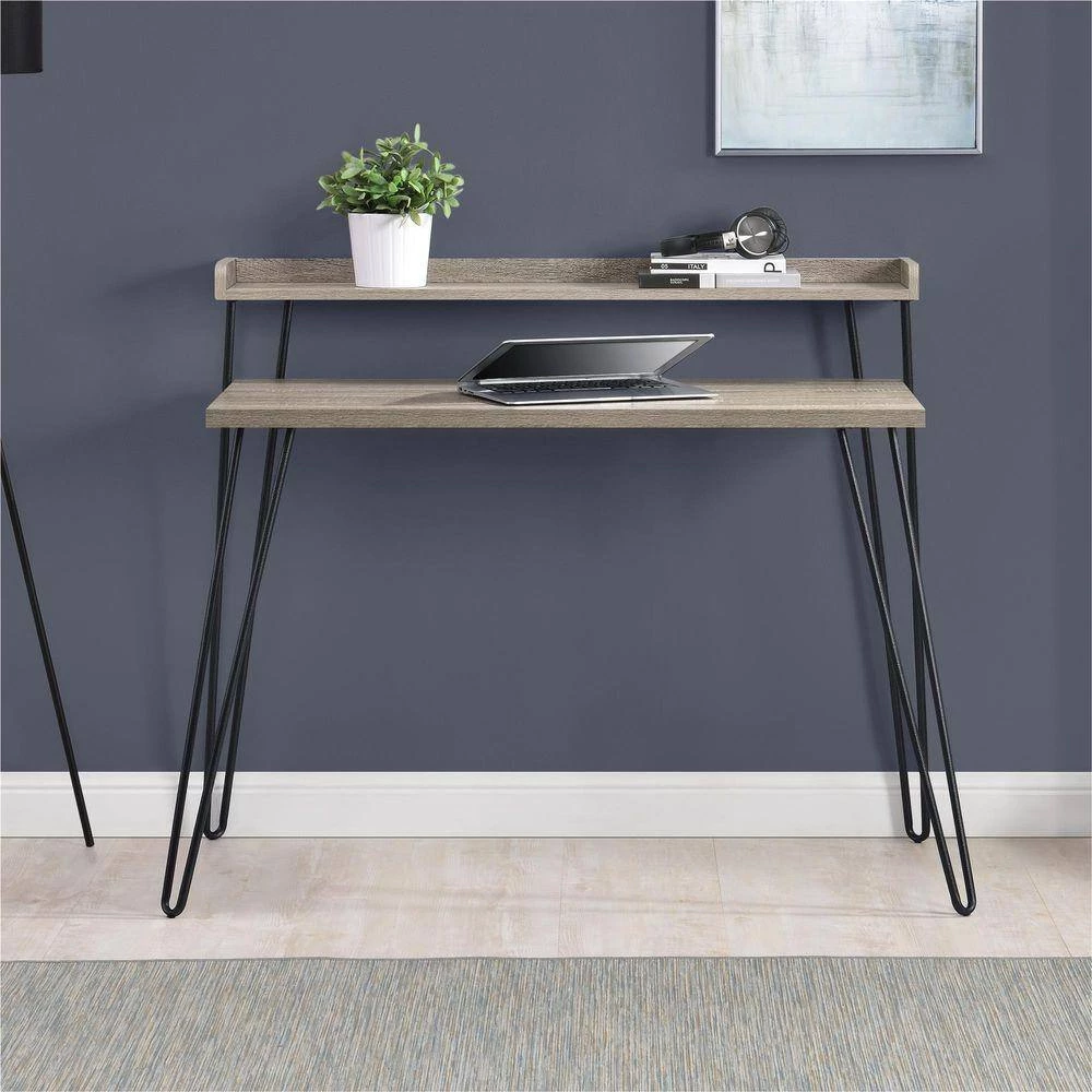Mix industrial and modern styles together to get the Ameriwood Shanewood Retro Desk with Riser. This Desk is perfect for tight spaces with its small foot print and offers 2-levels of desk space with the added riser. Use the Shanewood Desk in a home office or create an office space that works for you anywhere in your home. The desk top is large enough to hold your laptop, notebooks and office essentials while the riser can be used to keep items close by but out of your way. The Gunmetal Gray hairpin legs are a fun throwback to popular mid-century design. The light walnut wood grain Sonoma Oak finish coordinates with almost any decor. Ameriwood Shanewood Retro Desk with Riser requires minimal assembly upon delivery.