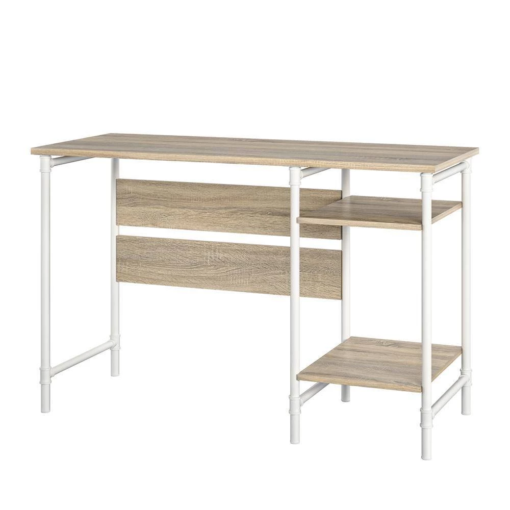 - Place your laptop, work lamp, and photos on the large desktop. Keep extra office supplies, paper, and manual handy on the 2 open side shelves to have easy access to everything you need to finish projects. End grain edge banding gives the Desk a realistic wood look