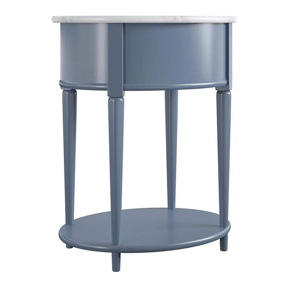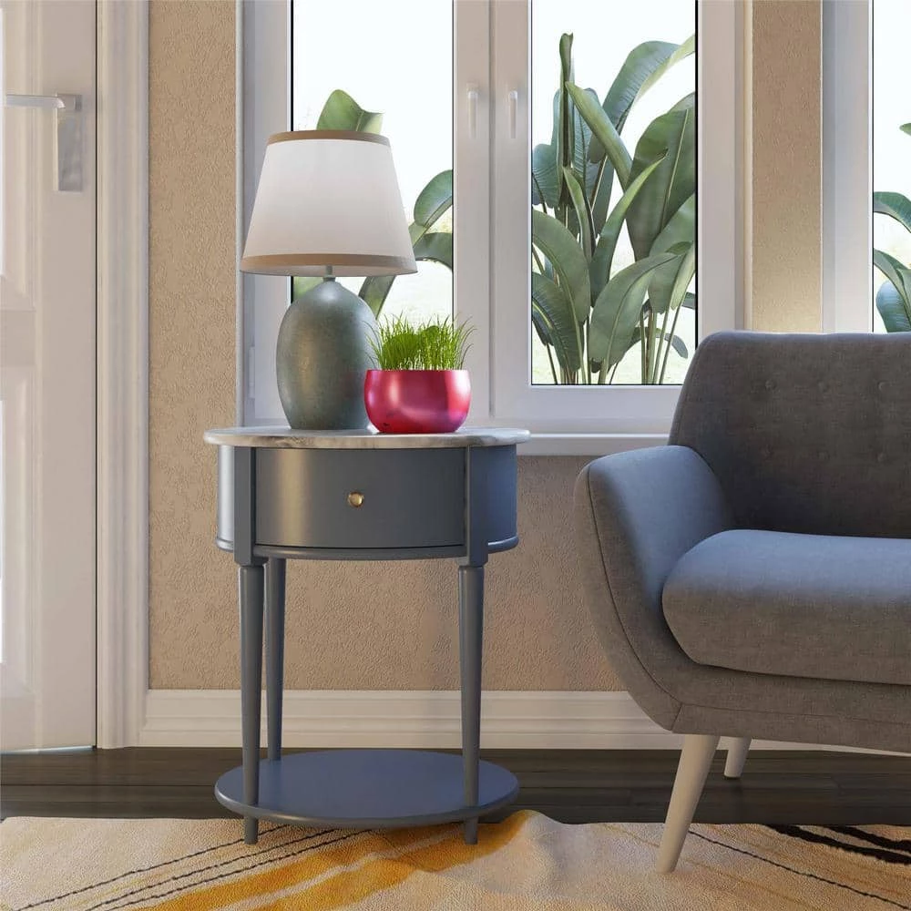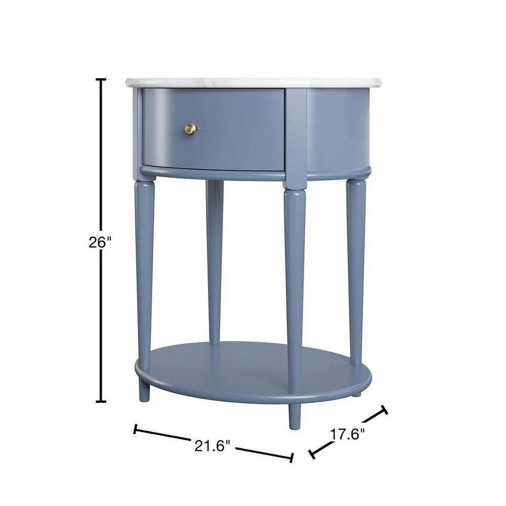 Introducing the Abelia End Table by Ameriwood Home. The classic design of the rounded marbled top and tapered legs blends effortlessly with an unexpected splash of pale blue to add a trendy and unique feel to your home. The End Table features a spacious drawer for storing remotes, coasters or clutter out of sight, and the lower shelf is perfect for books, magazines or even decorative items to cozy up the room. Because of its charming round design and storage, The Abelia End Table looks gorgeous as a bedside table as well. Made of plywood and painted MDF, the Abelia End Table is as durable as it is affordable and assembly is a snap. With the preassembled table top and drawer all ready to go right out of the box, just attach the legs and bottom shelf, and you’re off to more important things, like basking in the ambiance of a well decorated room. Assembled dimensions: 21.6 in. W x 17.6 in. D x 26 in. H. Assembled weight 29 lbs.