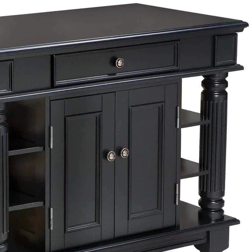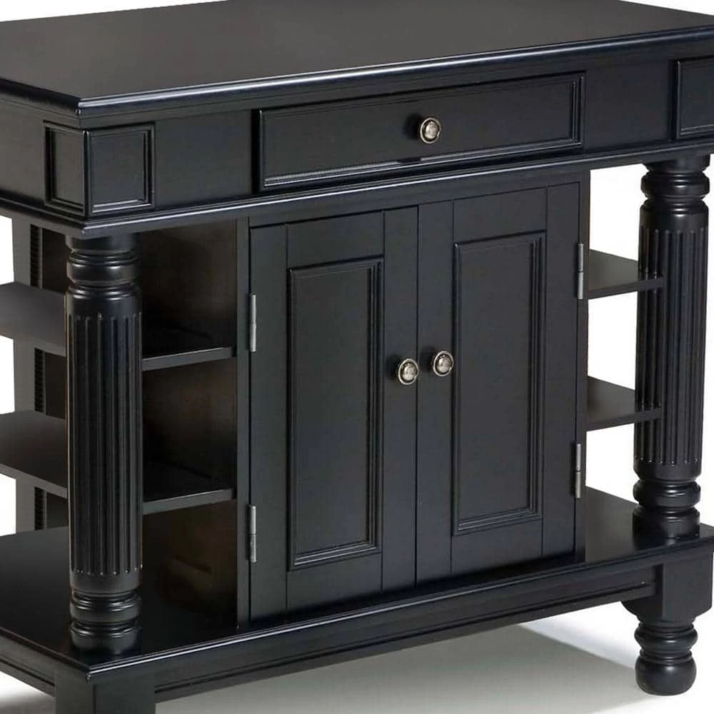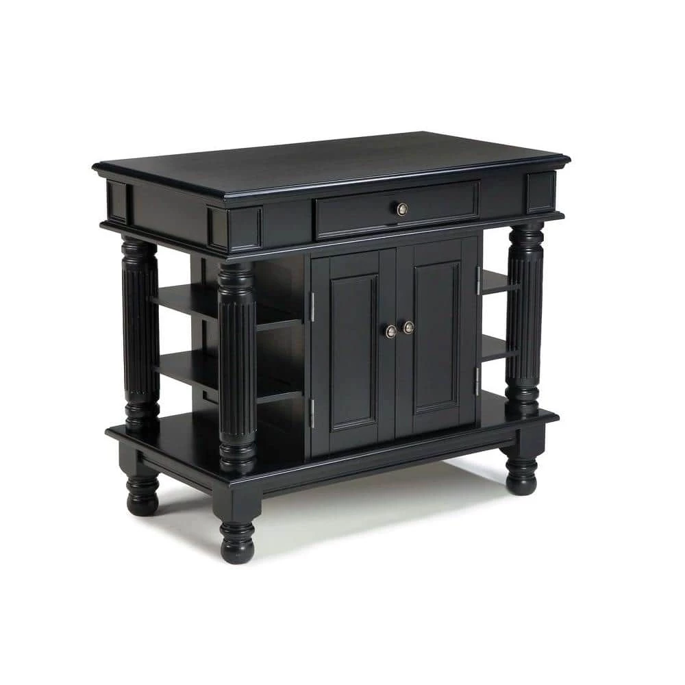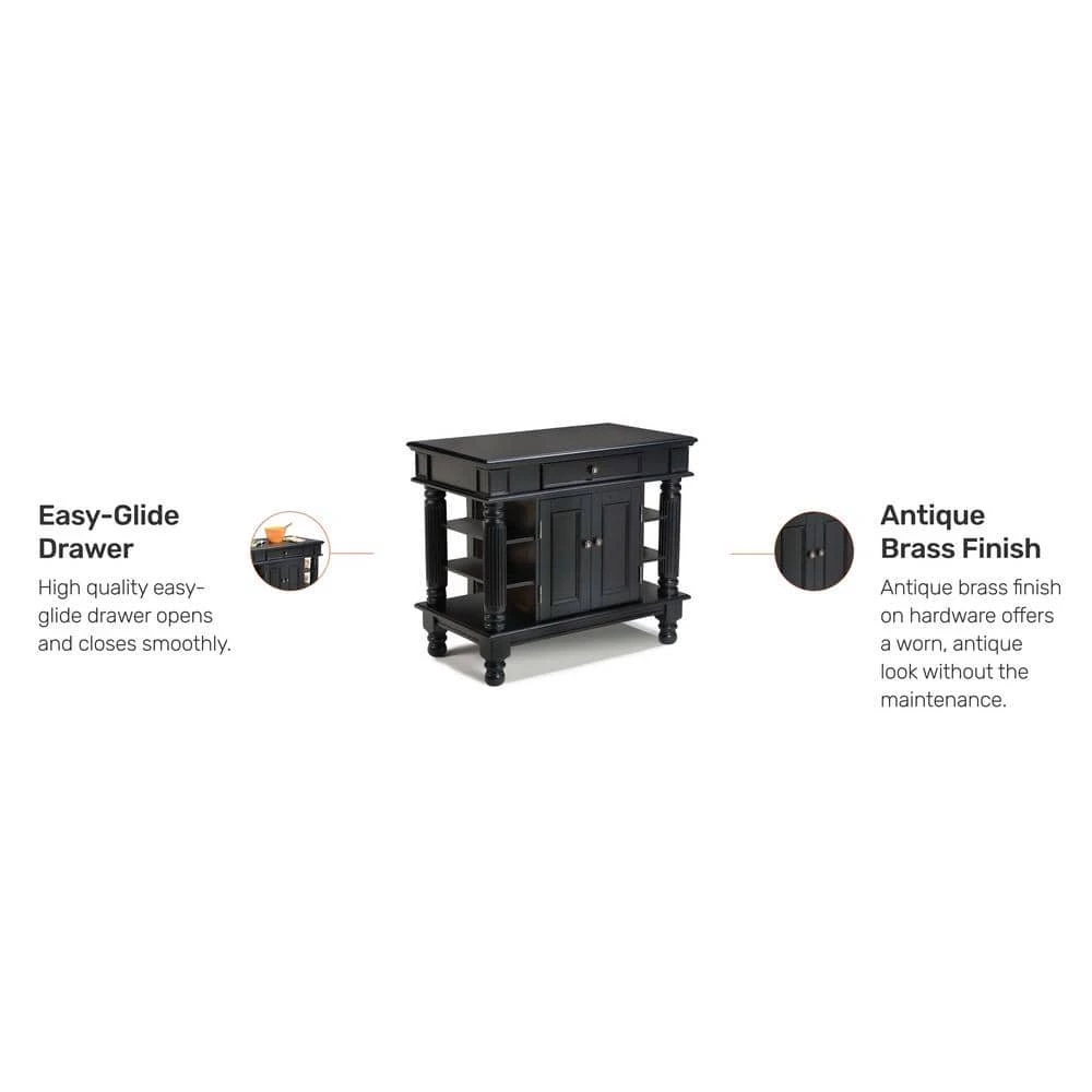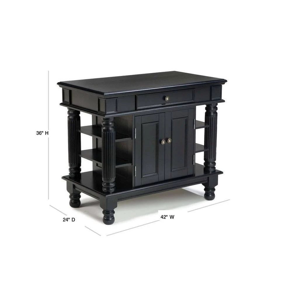 Home Styles Americana Kitchen Island is constructed of solid hardwoods and engineered woods with a rich multi-step Black finish. Features include antique pewter hardware, accessibility from both sides, easy glide large pass through drawer, raised detail cabinet doors on each side for easy access, and open storage with an adjustable shelf. Size: 42 in. W x 24 in. D x 36 in. H.
