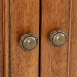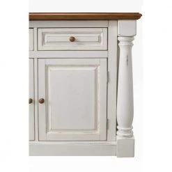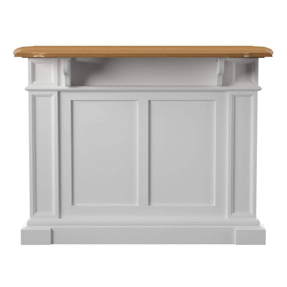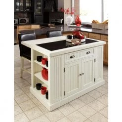 Complete your ultimate kitchen layout with this Homestyles Americana Kitchen Island Set with Two Stools. The distressed oak drop leaf top sits on a durable engineered wood frame, which features an off-white finish with antique nickel finish hardware. Loaded with space-saving features and adjustable storage options, it combines modern conveniences with a classic aesthetic. Add in two counter height stools that are designed to bring people together and you’ve got a set that’s a real conversation starter.