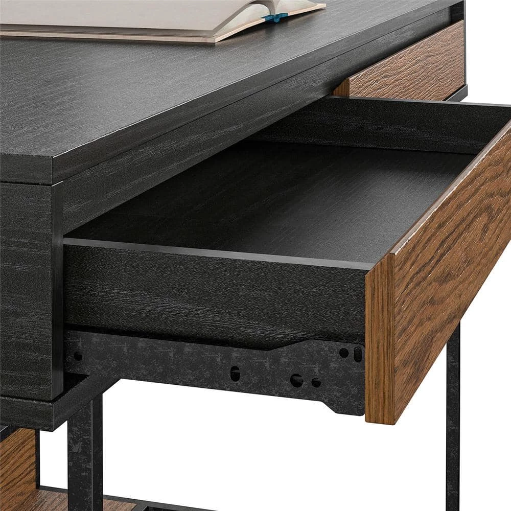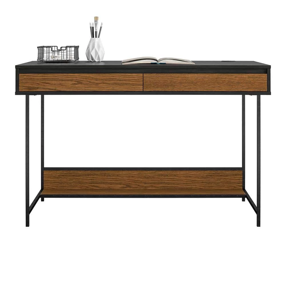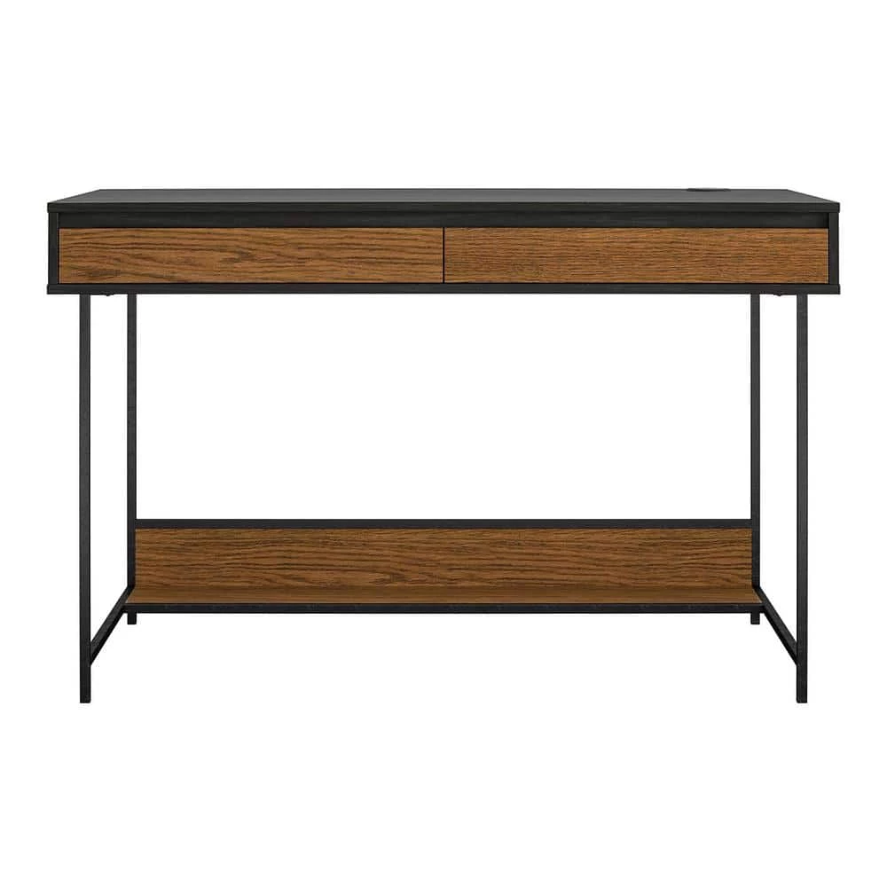 Upgrade your home office with a trendy mix of rustic and industrial styles with the Ameriwood Home Computer Desk. The beautiful two-tone black oak and medium brown woodgrain finish makes this piece an excellent fit for almost any style of decor. The Desk is made with a wood veneer drawer front and laminated particleboard chassis that pairs with the metal powder-coated metal frame for a durable build that will last for years. The spacious desktop can hold your laptop and printer so you can browse social media or finish projects. The desktop also features a wireless charger so you can power up your Qi-enabled electronics without the hassle of cords. The USB port option allows you to charge your electronics if they are not Qi-enabled. The 2-convenient drawers can store away your extra office supplies to keep your desktop clutter free. The Desk ships flat to your door and requires assembly upon opening. 2-adults are recommended to assemble. Once assembled, the Desk measures to be 30 in. H x 47.5 in. W x 23.5 in. D.