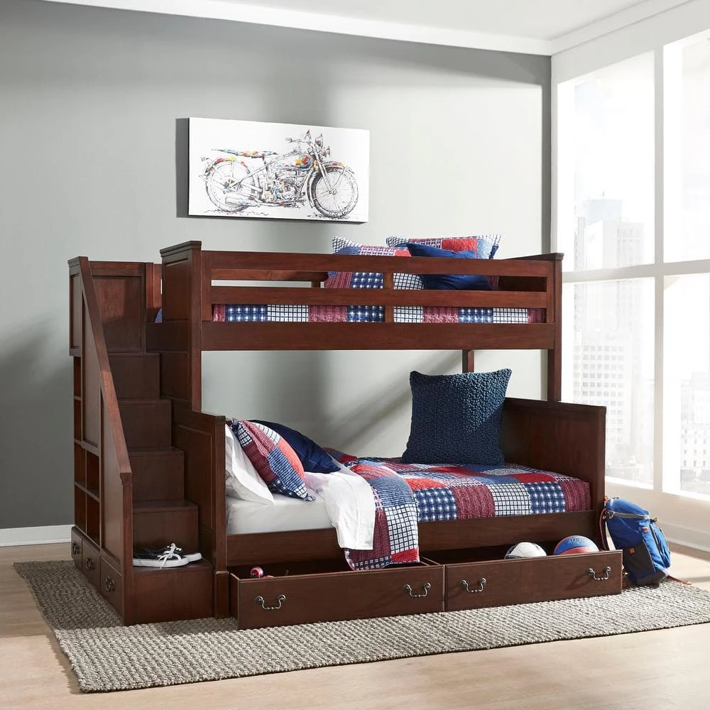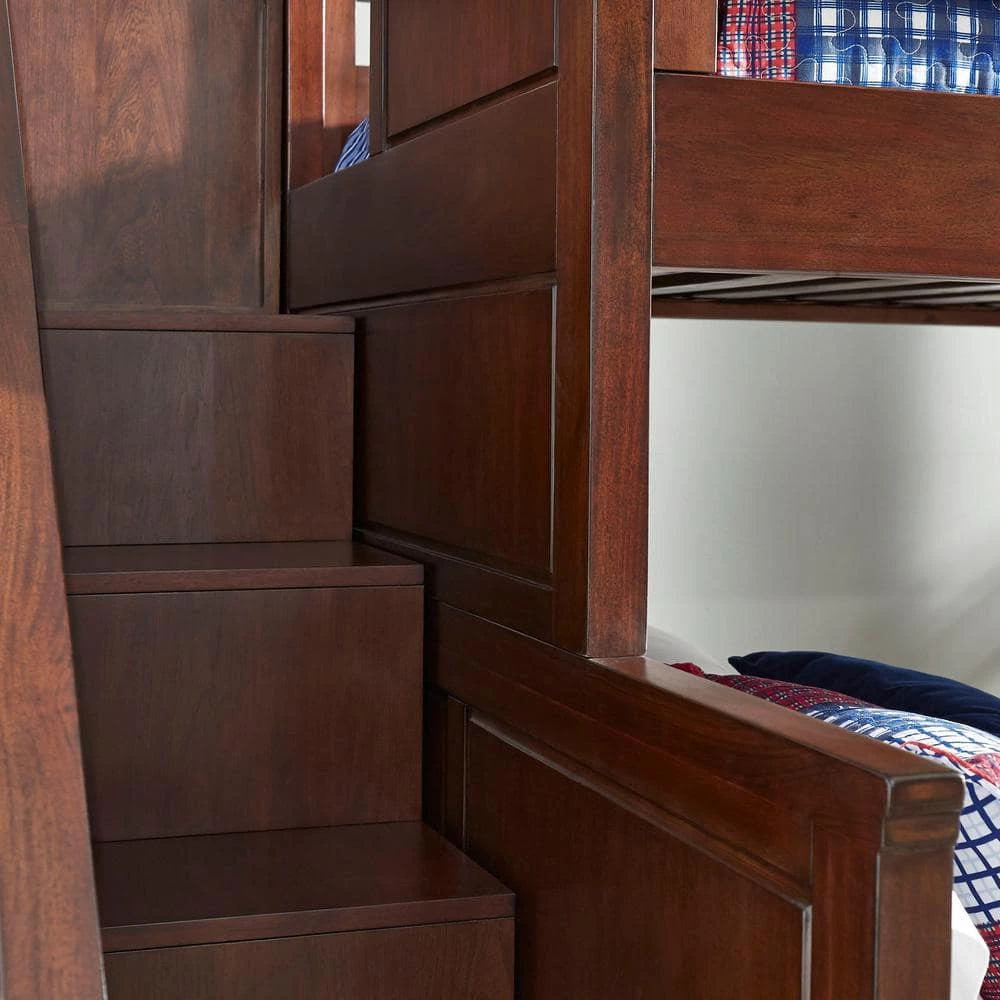 Create ambiance with a perfect balance of warmth and style with The Aspen Collection Twin over Full Bunk Bed with Stairs and 2-Drawer Set Under the Bed by HOMESTYLES. Mahogany solids and cherry veneers are warmed with a rustic cherry finish. Features a solid staircase for safe and easy access to the top bunk, with 6-cubbies and 3-drawers for storage. 2-drawers under the bed provide even more storage. Guard rails on the top bunk are designed to keep your child secure.