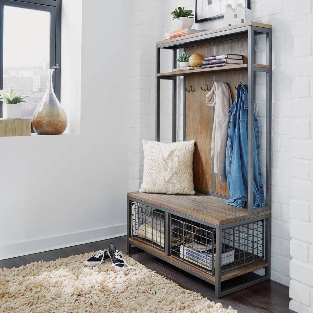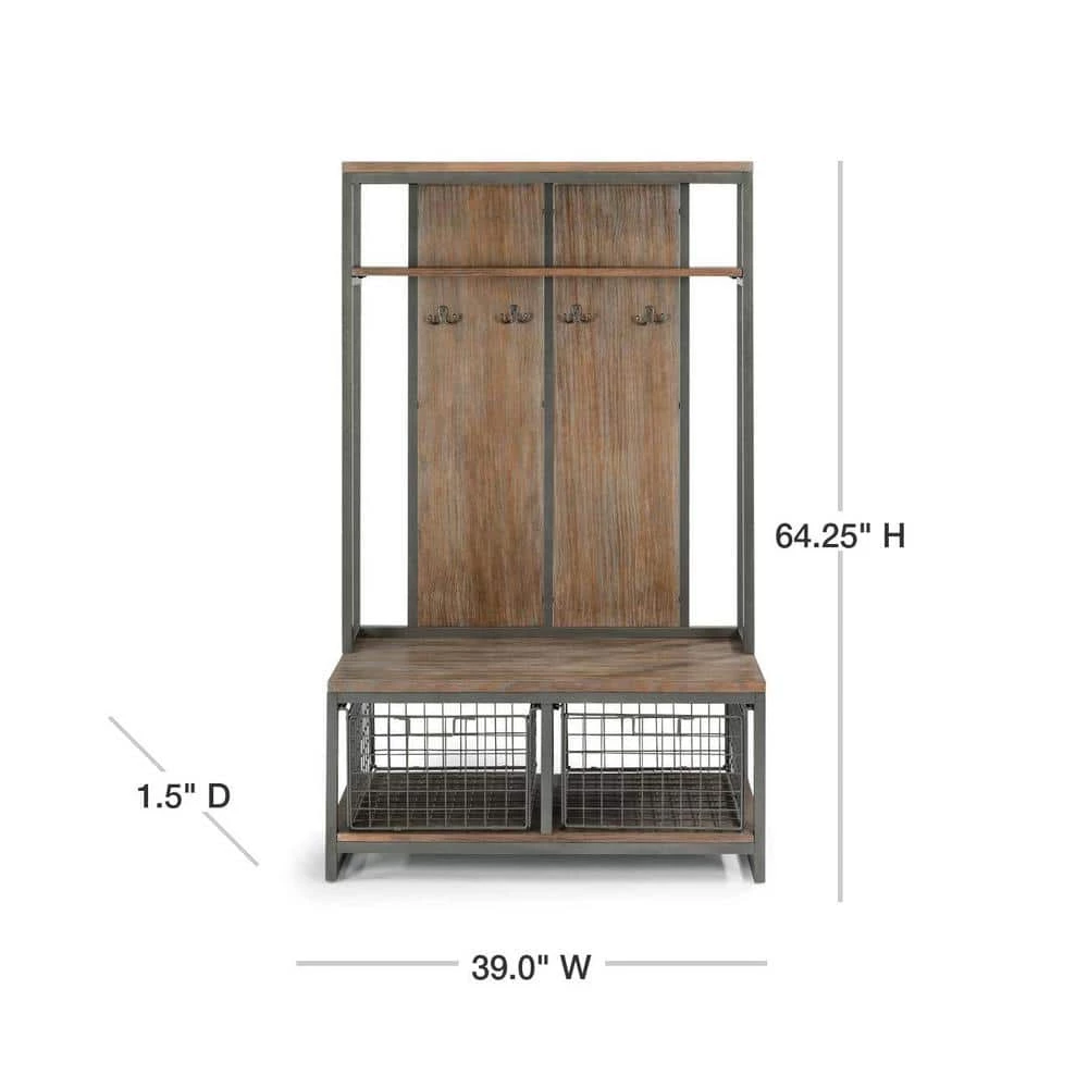 Alluring industrial design using mixed media materials of wire brushed pine veneer over engineered wood in a multi-toned driftwood finish, with metal tube frame in powder coated dark grey painted finish. The wire brushing proved a texture finish to all the wood areas. The unit features an upper shelf for storage, as well as, 2 slide-out and removable, lower wire basket storage, to help keep your entry area net and organized. Note finish and measurements may vary slightly. Assembly required. Delivered to your door, by home delivery service. W-39 in., D-18 in., H-64-1/4 in., seat height: 18 in.