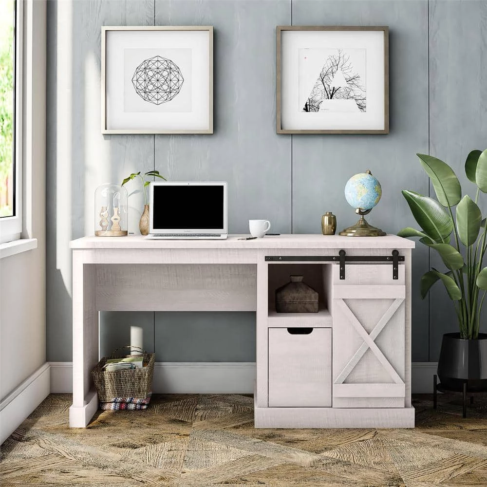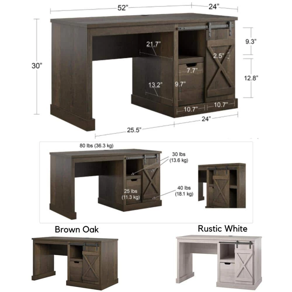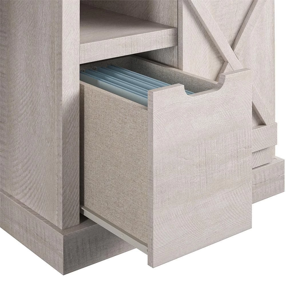 Give your home office a rustic touch with the Bayshore Heights Single Pedestal Computer Desk. Made of laminated MDF and particleboard, the rustic white woodgrain finish pairs with the sliding barn door to add a trendy rustic feel to your space. The desktop can accommodate your laptop and printer so you can work from home or browse the internet. The desktop also features a wireless charger with a USB port so you can either charge your Qi-enabled devices without the hassle of cords or plug them into the USB port to keep them charged all day. Behind the sliding barn door are 3 shelves and a file drawer to keep all of your important documents organized and your office essentials close. The Computer Desk ships flat to your door and requires assembly upon opening. 2-adults are recommended to assemble. Once assembled, the Computer Desk measures to be 30 in. H x 51.9 in. W x 24 in. D.