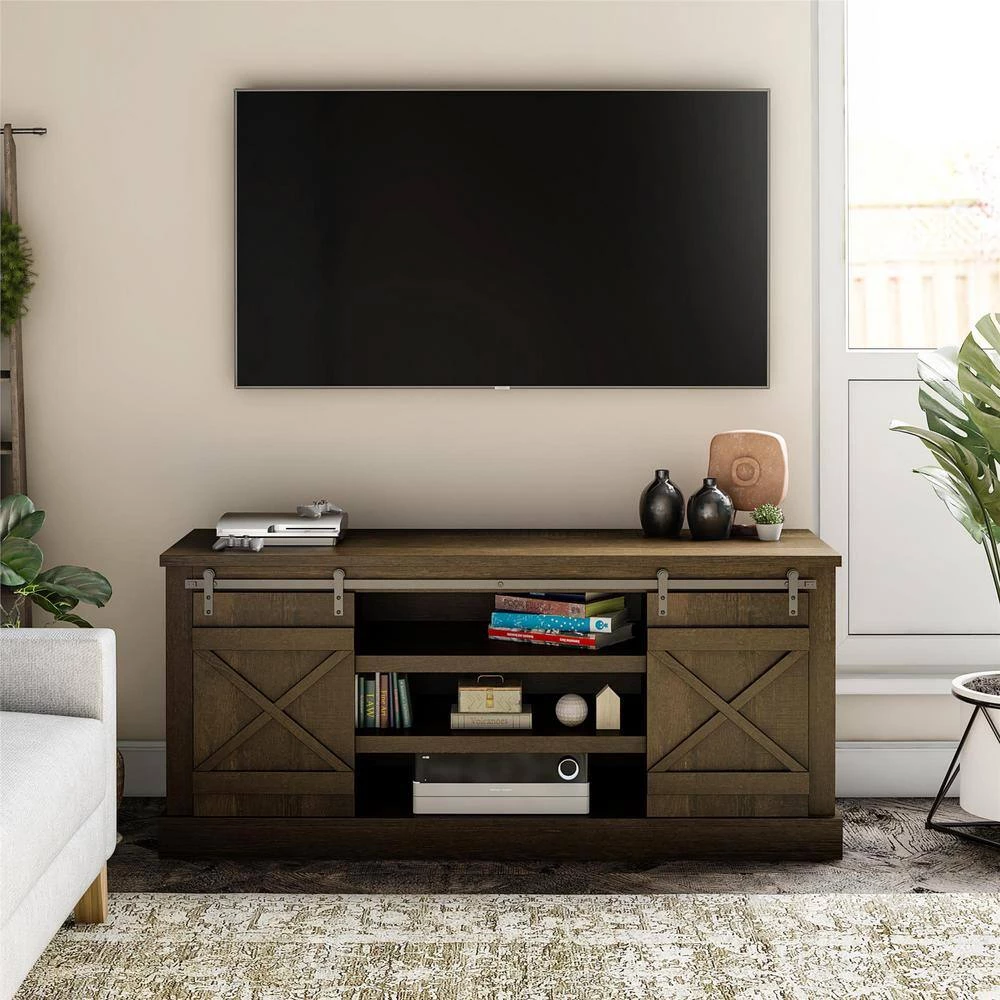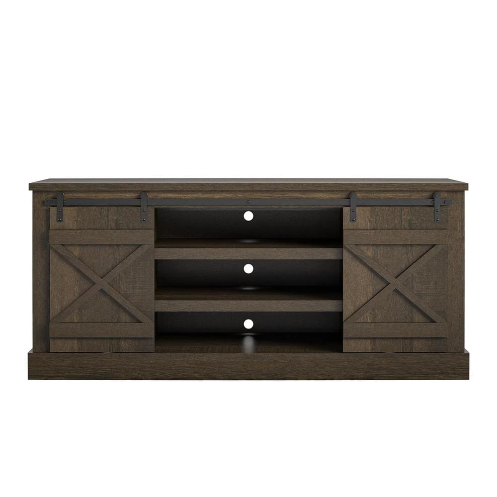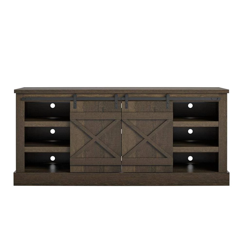 Add a rustic touch to your living room or entertainment space with the Ameriwood Home Bayshore Heights TV Stand. This stylish TV Stand can accommodate most TVs up to 70 in. wide or 120 lbs. Made of laminated MDF and particleboard, the brown oak woodgrain finish pairs with the sliding barn doors to add a trendy rustic feel to your space. The 3 middle shelves are perfect for your DVD or Blu-Ray player, cable box, and audio equipment and feature wire management holes to make plugging in devices simple. The 2 side cabinets offer 3 shelves each to organize your DVD and video games and also offer wire management holes so you can place speakers or smaller components on the shelves. The TV Stand ships flat to your door and requires assembly upon opening. Two adults are recommended to assemble. Once assembled, the TV Stand measures to be 26 in. H x 60 in. W x 20.5 in. D.