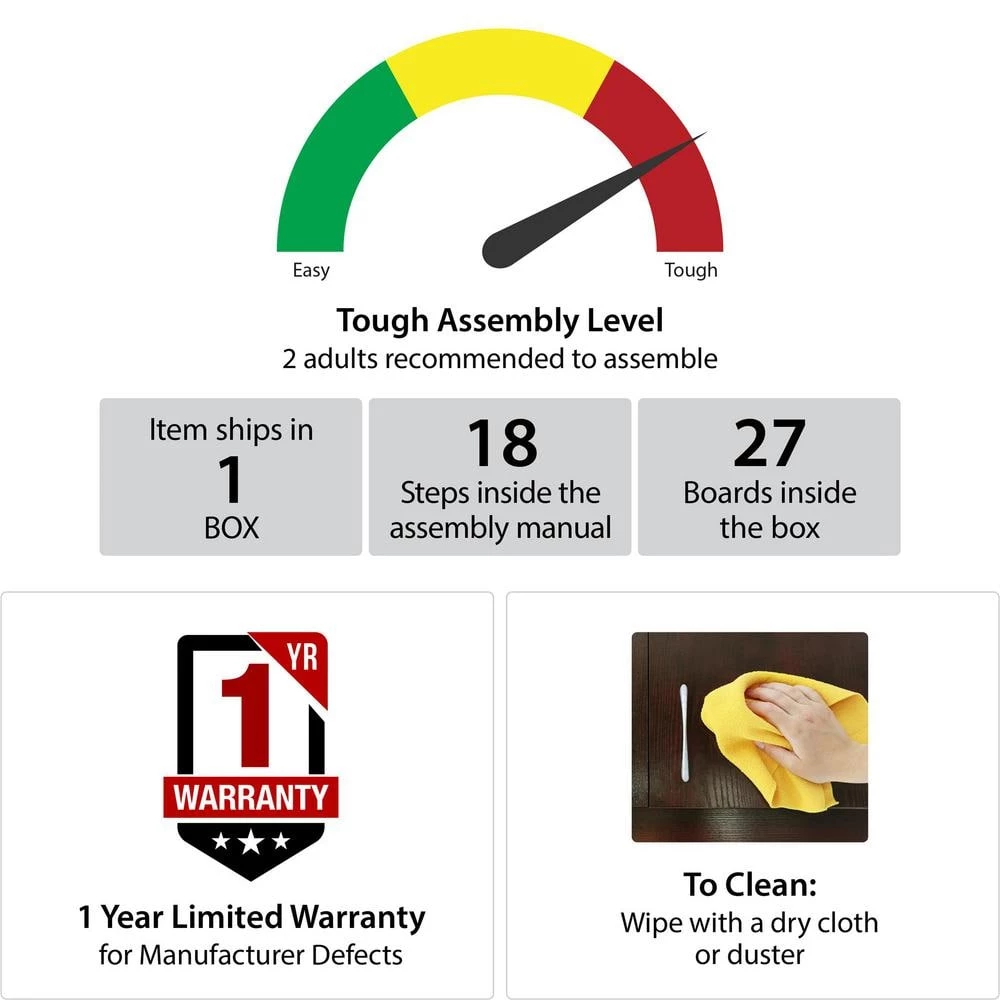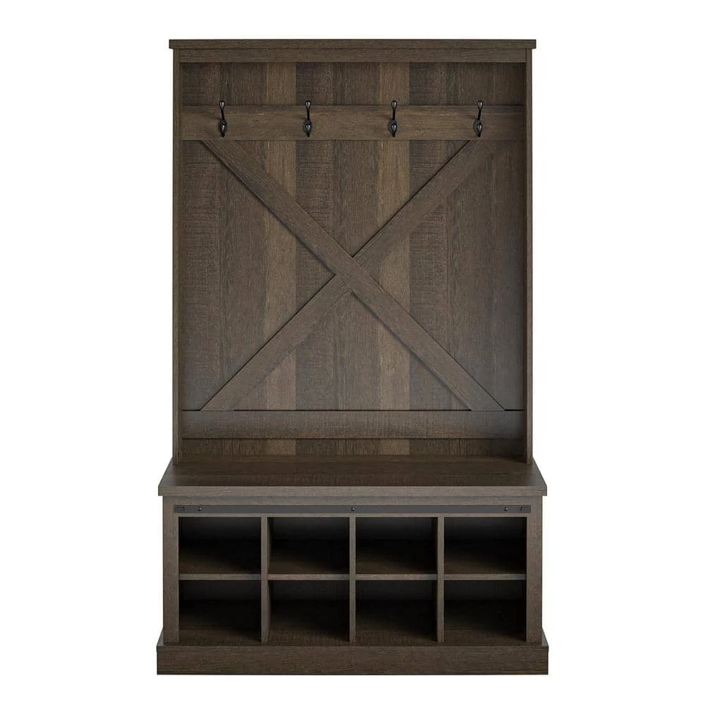 Organize the clutter in your entryway with the Ameriwood Home Bayshore Heights Entryway Bench with Hall Tree. Made of laminated MDF and particleboard, the brown oak woodgrain finish gives the Entryway Bench a rustic charm. Hang up coats, scarves, and bags on the 4 metal hooks. The 8 shoe cubbies will keep all of your shoes from piling up around your door. The convenient bench is perfect for taking your shoes off after a long day or putting them on before you head out the door. A wall anchor kit is included to secure the Entryway Bench to the wall and prevent tipping injuries. The Entryway Bench ships flat to your door and requires assembly upon opening. Two adults are recommended to assemble. Once assembled, the Entryway Bench measures to be 64.6″H x 39.6″W x 18.1″D.