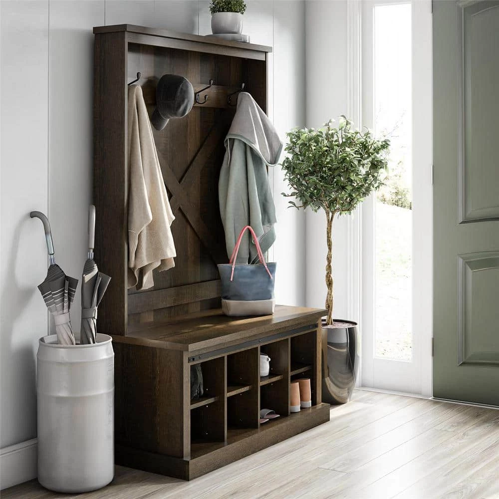 - Organize the clutter around your entryway with the Ameriwood Home Bayshore Heights Entryway Bench with Hall Tree