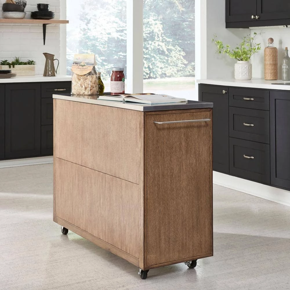 California contemporary design with a slightly weathered look of a driftwood natural brown oak finish. Crafted from ash hardwood solids and straight grain oak veneers over engineered wood. 2-outside doors with European hinges, open to large storage areas with 2-adjustable shelves in each. 4-center drawers for added storage. Finished on all 4-sides so it can be used as an island. Casters on all 4-corners, for easy mobility, with 2 of them locking. Doors and drawers feature unique open handle pulls, in brushed nickel finish, with brushed nickel finished metal towel bars on each side. Note finish and measurements many vary slightly. Assembly required. Arrives to your door by parcel delivery service. 49 ¼ in. W, 18 ½ in. D, 35 in. H.