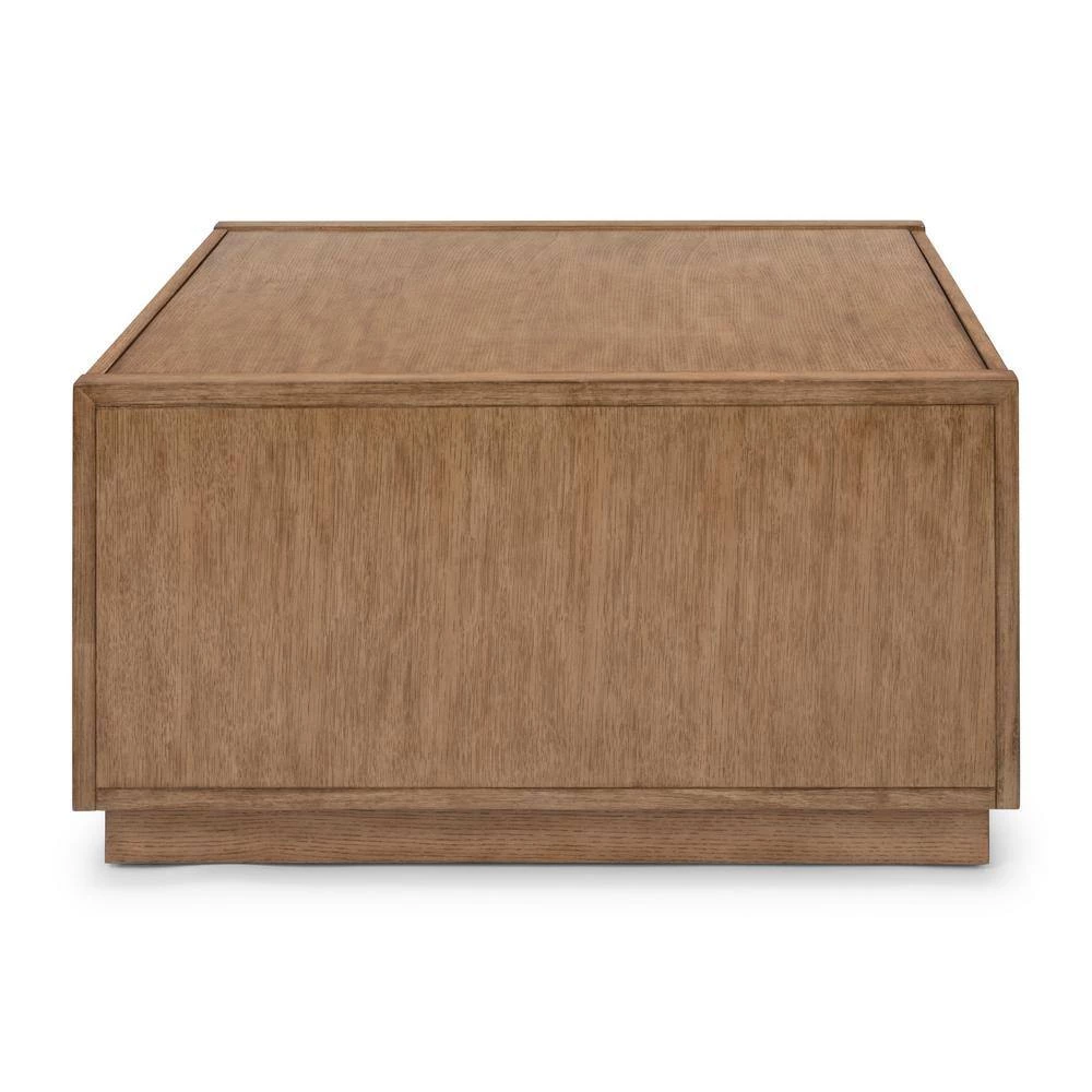 California contemporary design with a slightly weathered driftwood, natural brown oak finish. The Big Sur Coffee Table by HOMESTYLES is crafted from hardwood-solids and straight grain oak veneers over engineered wood.-solid wood surfaces have a wire-brushed texture, providing a weathered look. 2-upper-drawers on each side, with lower open storage area. Unique open-handle-drawer pulls in a brushed nickel finish. Raised plinth base adds to the straight-line contemporary design. Ideal for use with sectional, or with sofa and love seat combinations. Finish and measurements may vary slightly. Arrives at your door by parcel delivery service. Assembly required. Measures: 19 in. H x 36 in. W x 36 in. D.