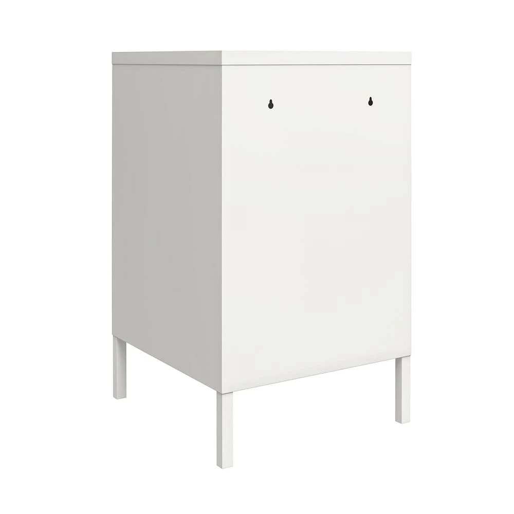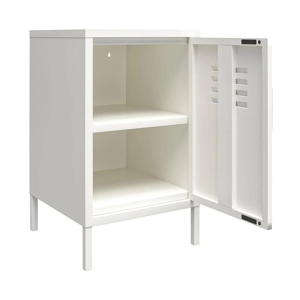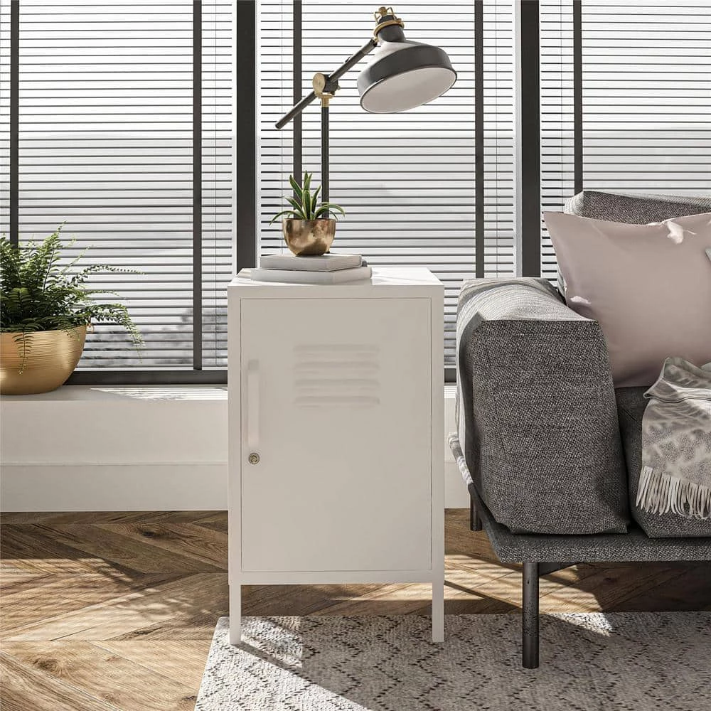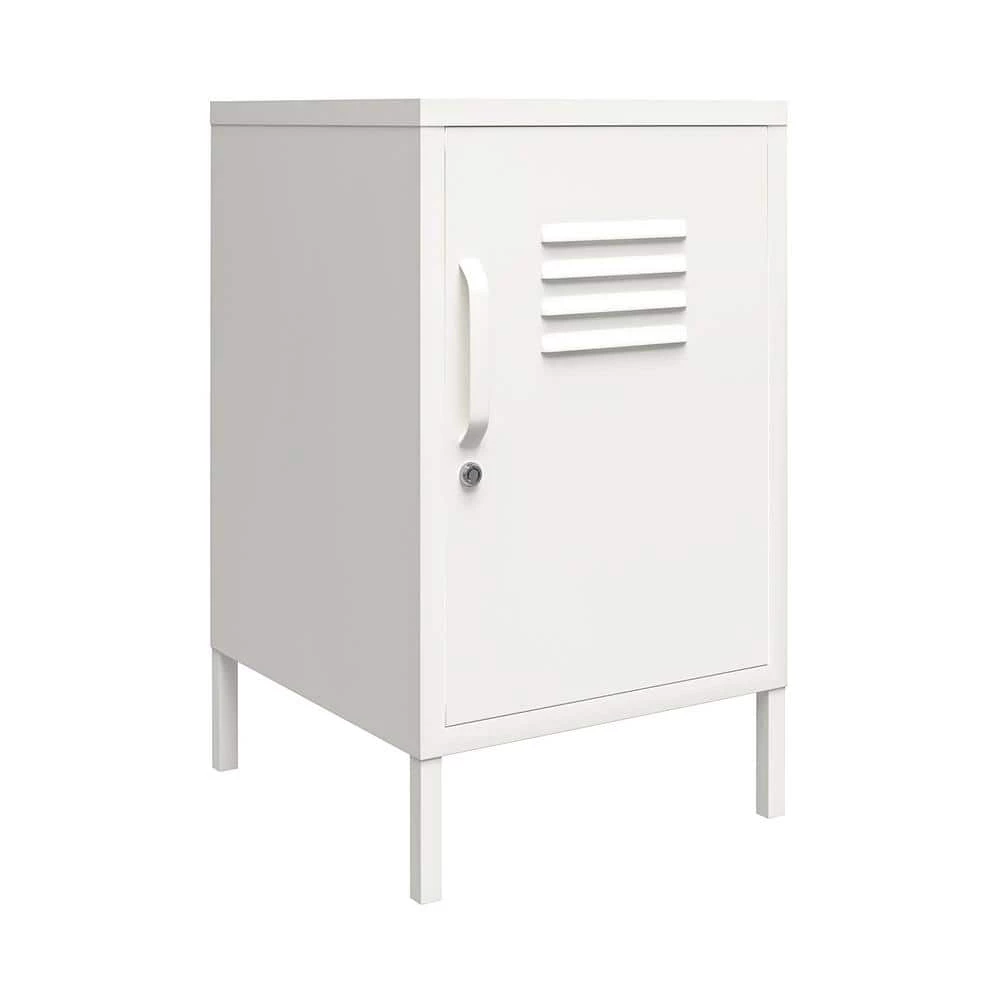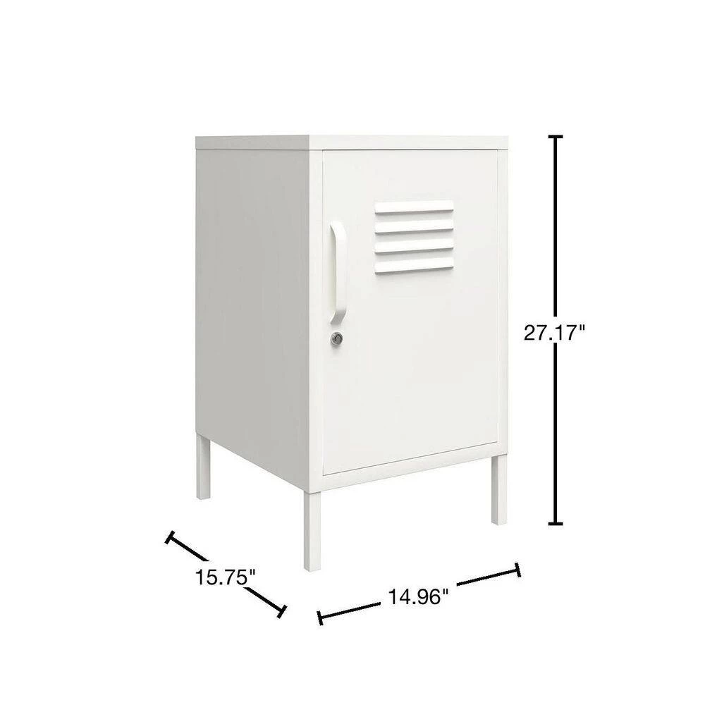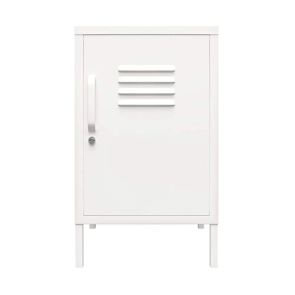 Add a fun and funky end table to your living room with the SystemBuild Bonanza Metal Locker End Table. Made of powder-coated metal, the bright white color and locker style design adds a fun twist to your living room collection. The metal can be cleaned with a damp cloth so you can easily clean spills. The 2-shelves behind the locker style door are perfect for organizing books, magazines, and electronics. The door features a lock so you can keep your little ones out of your things. A wall anchor kit is included to secure the End Table to the wall. The End Table ships flat to your door and requires assembly upon opening. 2-adults are recommended to assemble. Once assembled, the End Table measures to be 27.17 in. H x 14.96 in. W x 15.75 in. D.