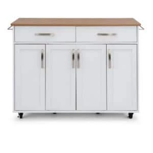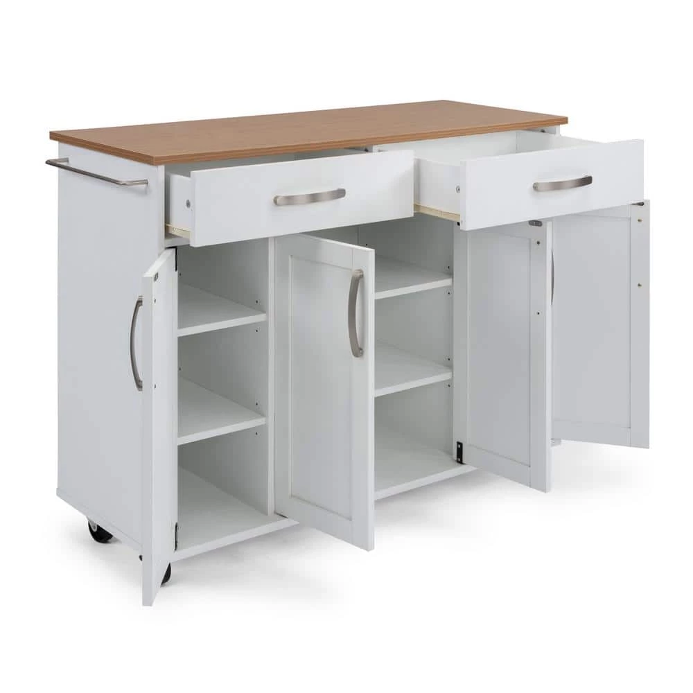 Organize your kitchen with this Homestyles kitchen cart. Two storage drawers, four doors and adjustable shelves provide ample space for your pantry items. For more convenience, it offers a wood top, towel bar and two locking casters. Brushed nickel hardware creates a sleek look.
