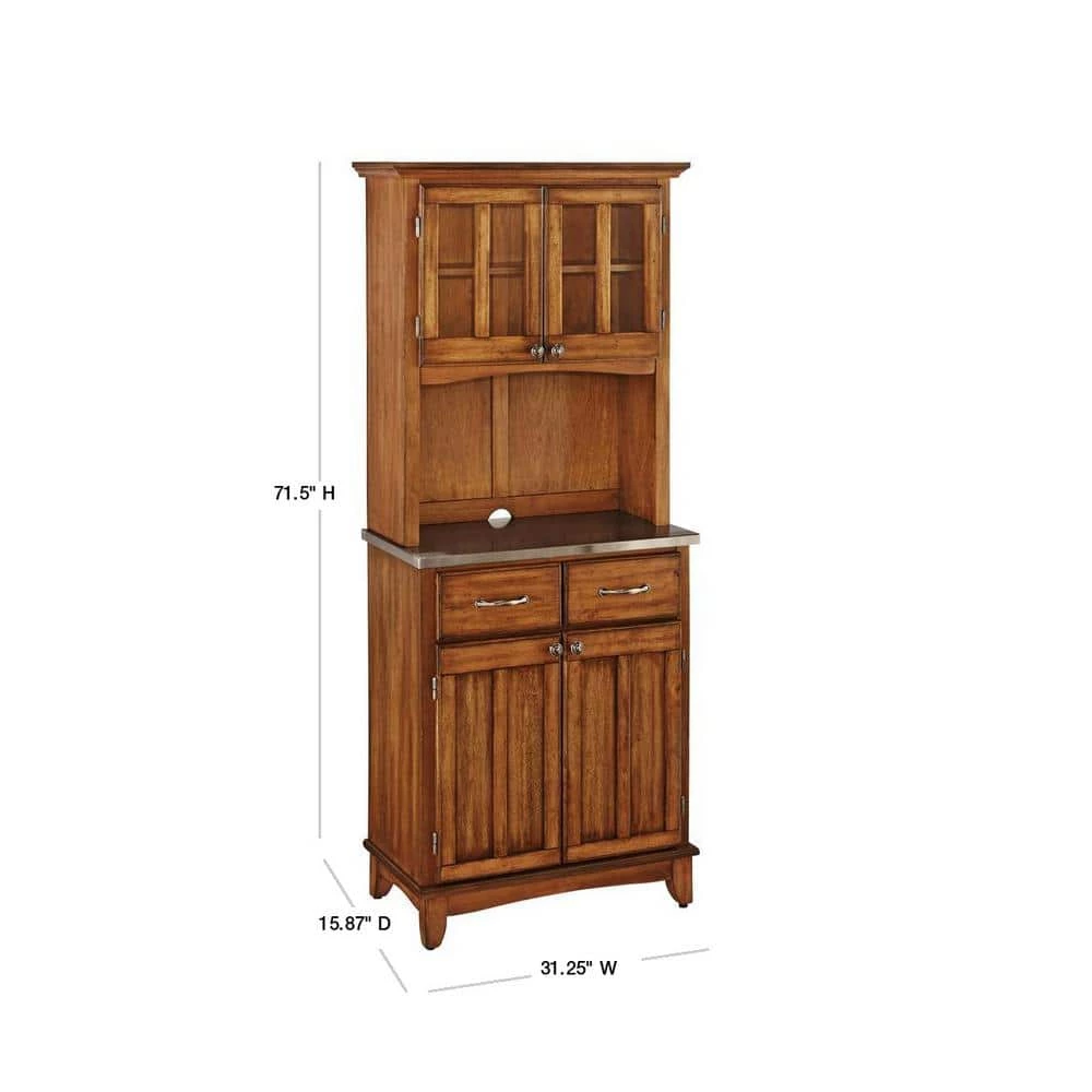 Add storage and style to your home with this Cottage Oak and Stainless Buffet with Hutch. It features a solid hardwood construction that’s highly durable with a stainless steel top, cottage oak body and brushed steel hardware. It has plenty of space for organization with two cabinet doors with an adjustable shelf inside, two drawers and two plexiglass doors on the hutch with another adjustable shelf.