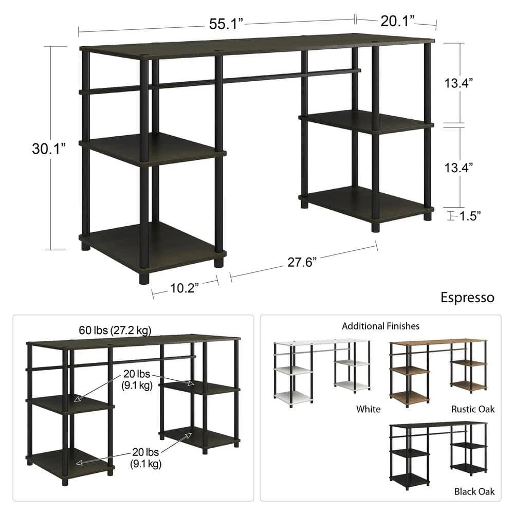 - Computer desk ships flat to your door and goes together by simply screwing in all of support bars to shelves desktop can support up to 60 lbs. each shelf can hold up to 20 lbs. assembled dimensions: 30.12 in. H x 55.12 in. W x 20.08 in. D