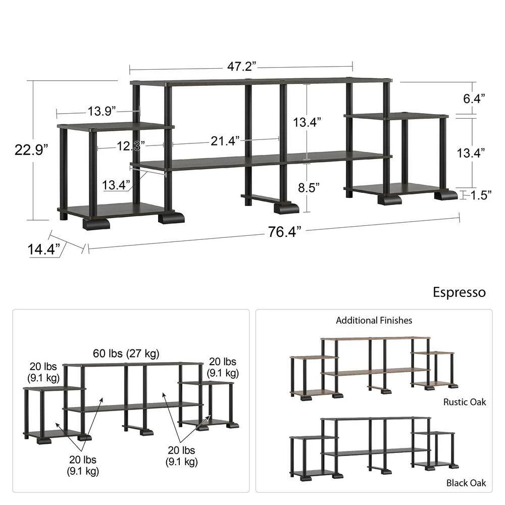 - TV stand ships flat to your door and goes together by simply screwing in all of the support bars to the shelves. TV stand can support up to 60 lbs. each shelf can hold up to 40 lbs. assembled dimensions: 22.95 in. H x 76.38 in. W x 14.41 in. D