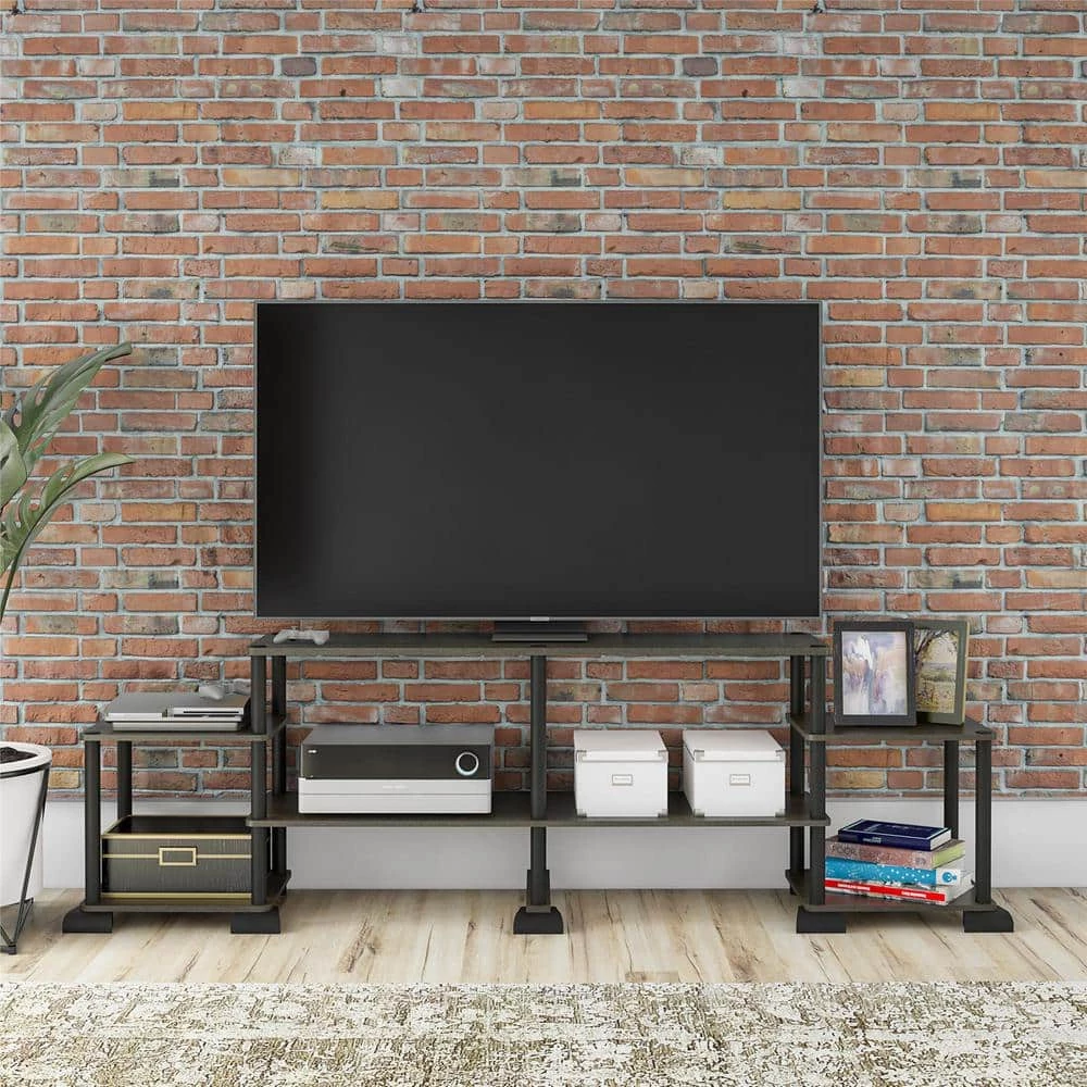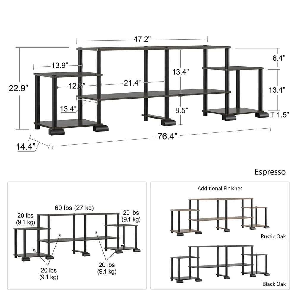 - TV stand ships flat to your door and goes together by simply screwing in all of the support bars to the shelves, TV stand can support up to 60 lbs. each shelf can hold up to 40 lbs. assembled dimensions: 22.95 in. H x 76.38 in. W x 14.41 in. D