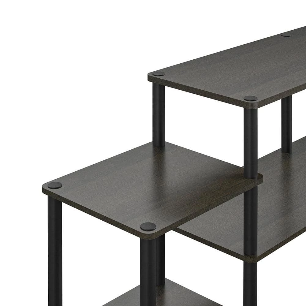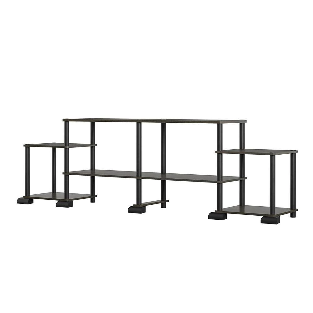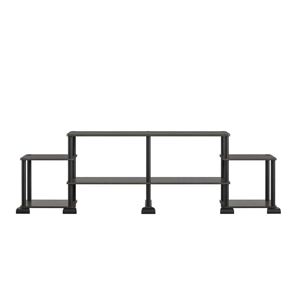 Set up your living room or entertainment space quickly and easily with the Ameriwood Home Crocker Toolless TV Stand. This simple yet sturdy TV Stand can accommodate most TVs up to 50 in. wide or up to 60 lbs. Made of laminated particleboard, the classic dark espresso woodgrain finish can easily fit into your existing decor. The open shelving allows proper air circulation for your audio and video components and makes it easy to plug in all of your devices. The TV Stand ships flat to your door and goes together by simply screwing in all of the support bars to the shelves. No tools required means you can be watching your favorite shows or sports in no time. Once assembled, the TV Stand measures to be 22.95 in. H x 76.38 in. W x 14.41 in. D.