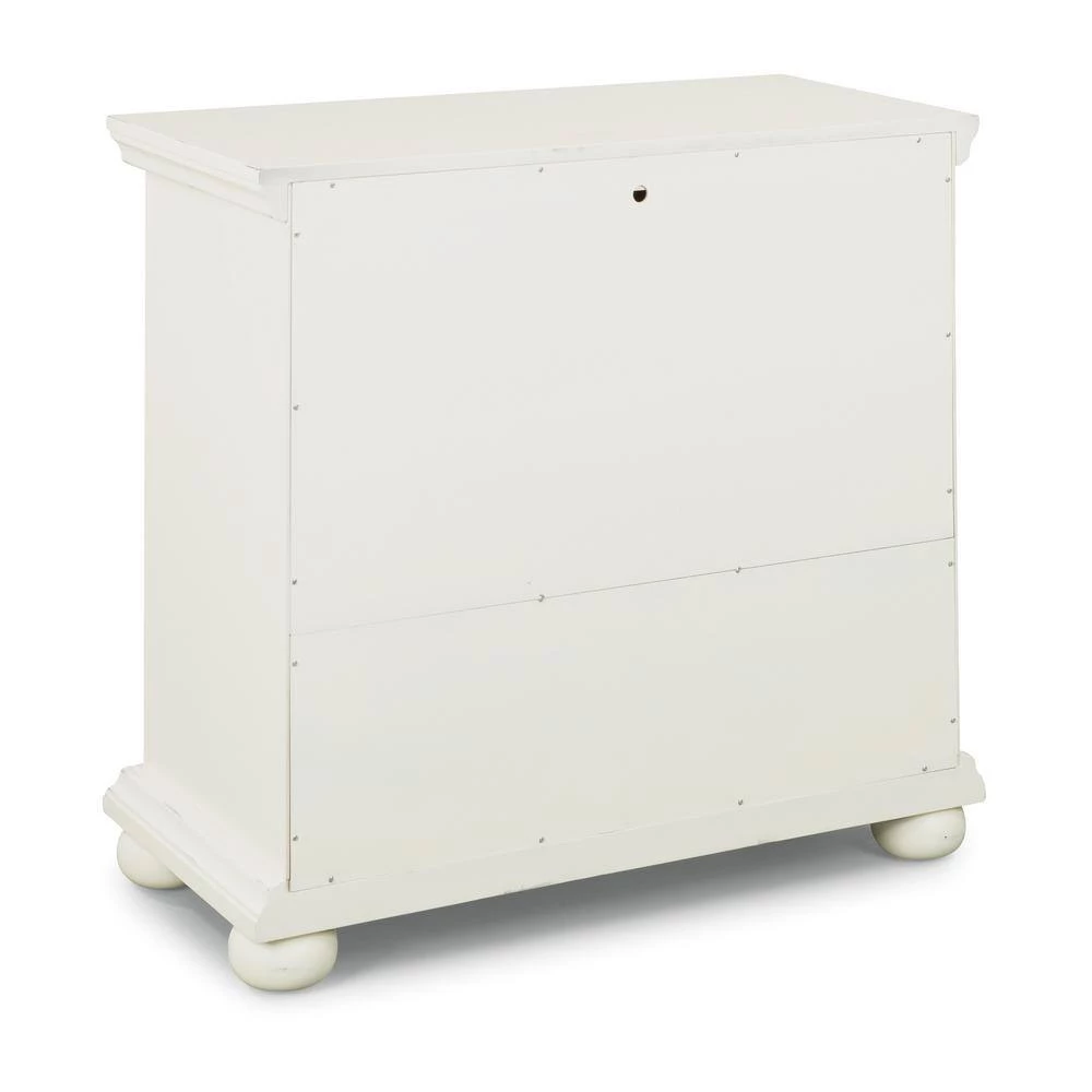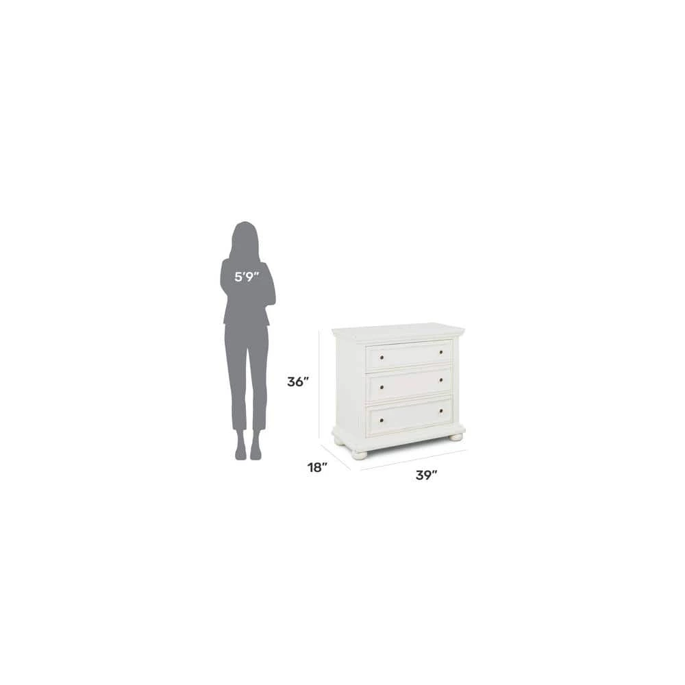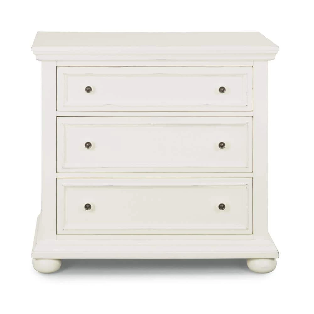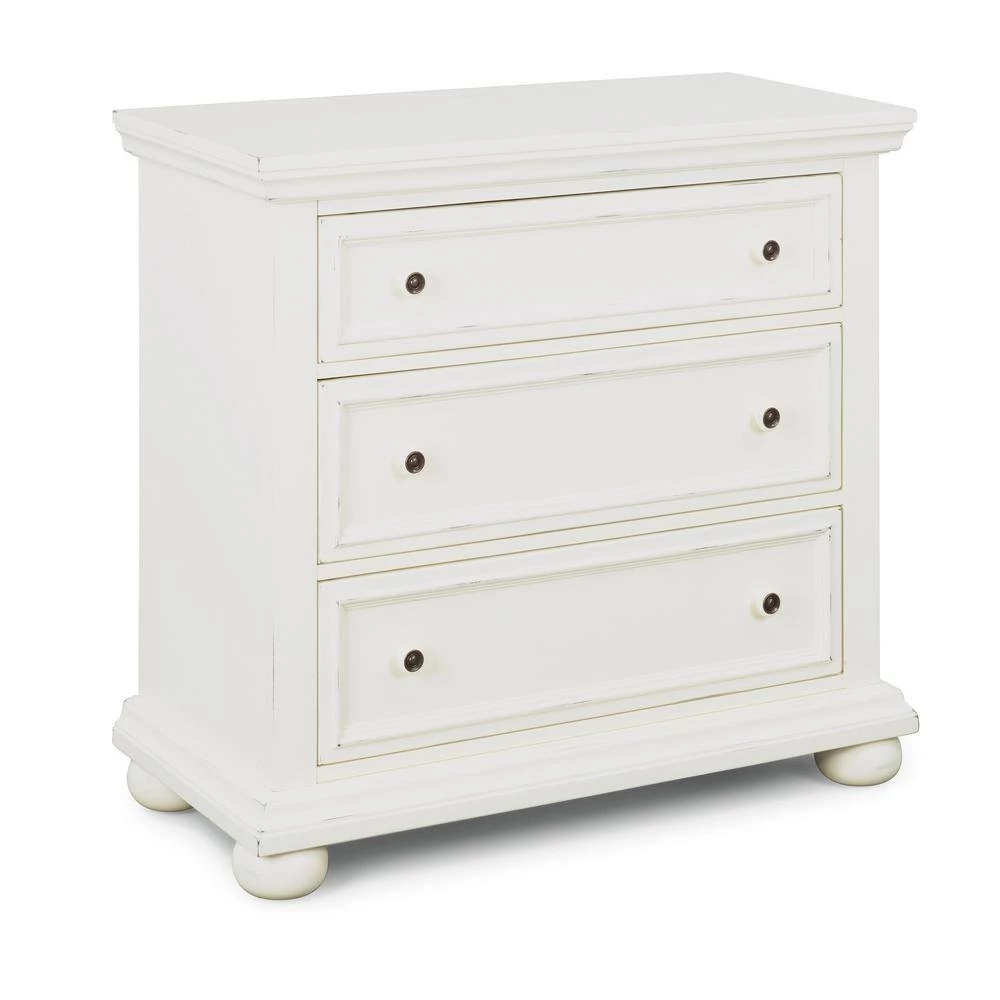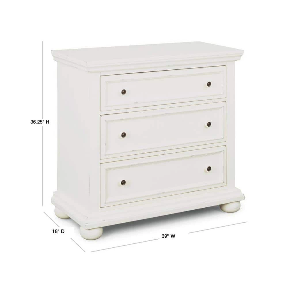 A blend of urban farmhouse style with traditional bun foot design. Crafted of mahogany solid and engineered woods, in a crisp white painted finish, with physical distressing, and lightly hand rubbed aged areas on the edges. Three drawers, with the top drawer featuring a felt bottom, to protect your more delicate items. Drawer pulls are a unique wood and metal combination with the center metal areas finished in an antiqued nickel which adds to the distinct design. All drawers feature easy glide metal side guides. Note finish and measurements may vary slightly. Assembly required. Delivered to your door, by home delivery service. W-39, D-18, H-36