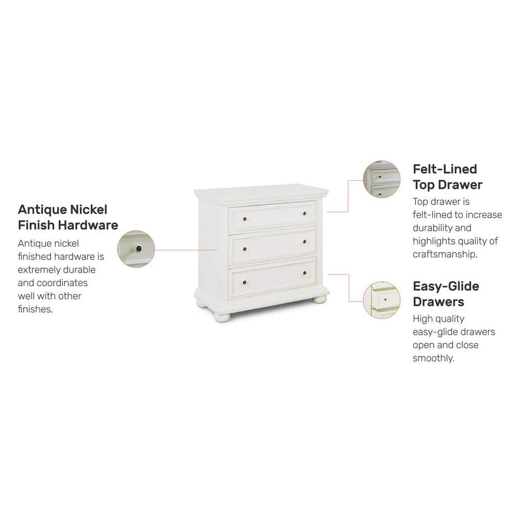 - Three drawers, with the top drawer featuring a felt bottom, to protect your more delicate items. Drawer pulls are a unique wood and metal combination with the center metal areas finished in an antiqued nickel which adds to the distinct design. All drawers feature easy glide metal side guides.