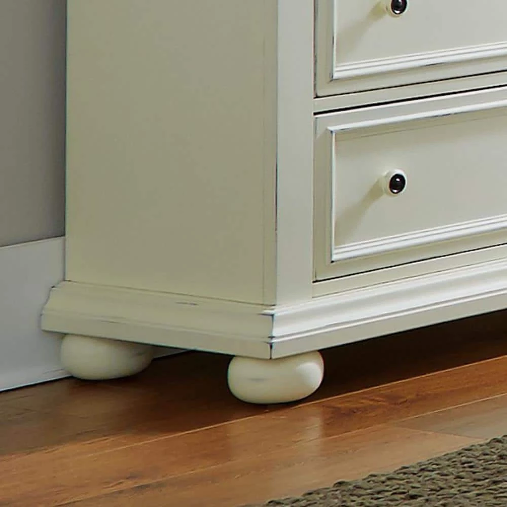 - A blend of urban farmhouse style with traditional bun foot design. Crafted of mahogany solid and engineered woods, in a crisp white painted finish, with physical distressing, and lightly hand rubbed aged areas on the edges.