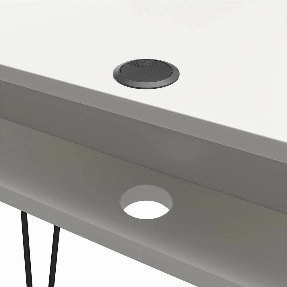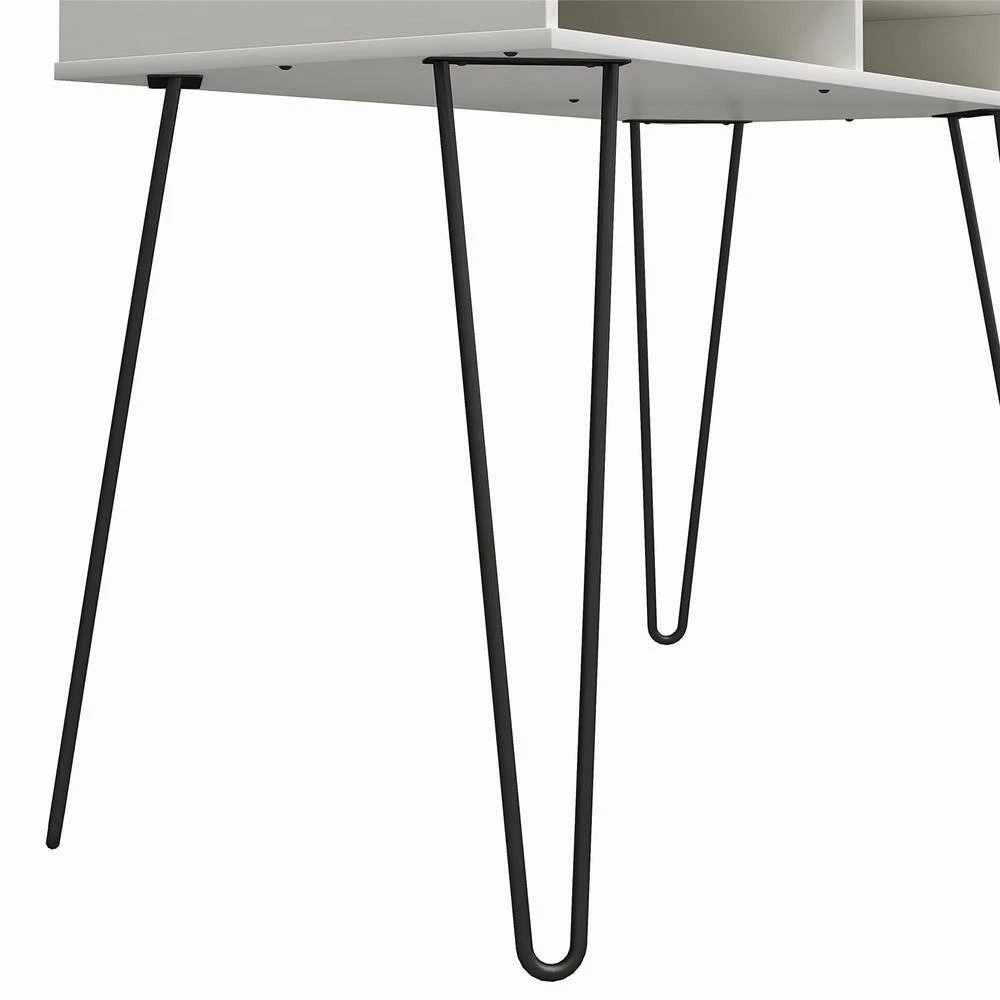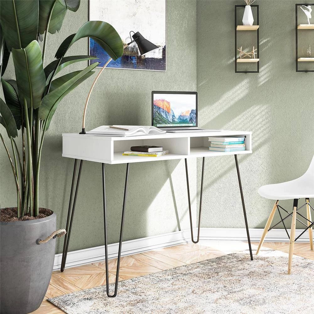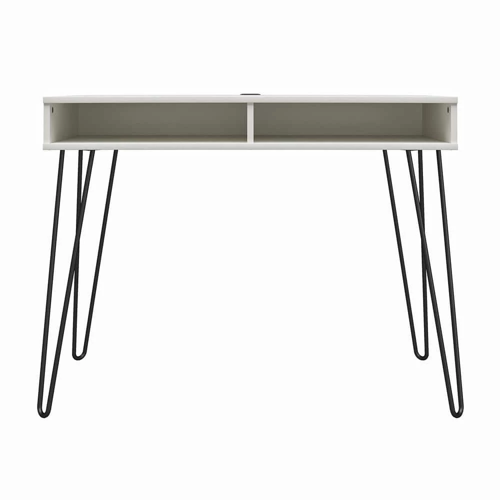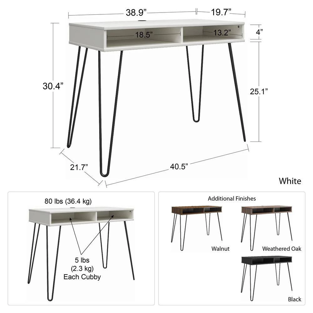 Add some mid-century style to your space with the Ameriwood Home Joshua Computer Desk with-storage. This Desk features a clean white finish on the laminated particleboard that pairs with the black powder-coated metal hairpin legs for an elegant, retro style. The minimalistic design makes this Desk a perfect addition to your dorm room or small apartment. The desktop is large enough for you to finish homework or browse social media on your laptop. The 2-open cubbies allows you to-store notebooks, writing utensils, and papers off of the desktop but still within reach to keep your workspace clutter free. The back of the desk features a long open cubby that is perfect for hiding a power strip. A wire grommet keeps your cords organized and tangle free. The top of the Desk comes preassembled to make assembly quick and easy by simply attaching the 4-legs. The Desk ships flat to your door and minimal assembly is required. Once assembled, the Desk measures to be 30.4 in. H x 40.5 in. W x 21.65 in. D.
