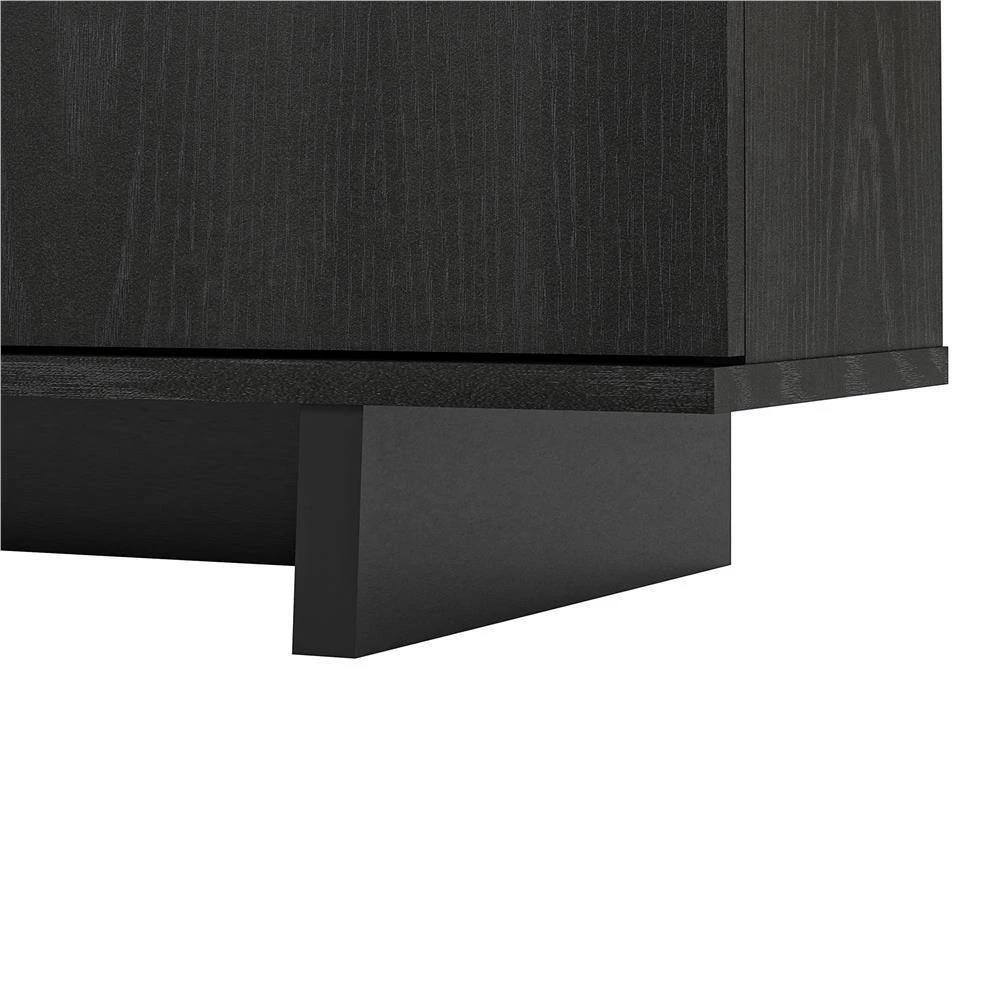 - Made of laminated particleboard, the classic black oak woodgrain finish and black H panel feet and hardware give the TV Stand an updated look