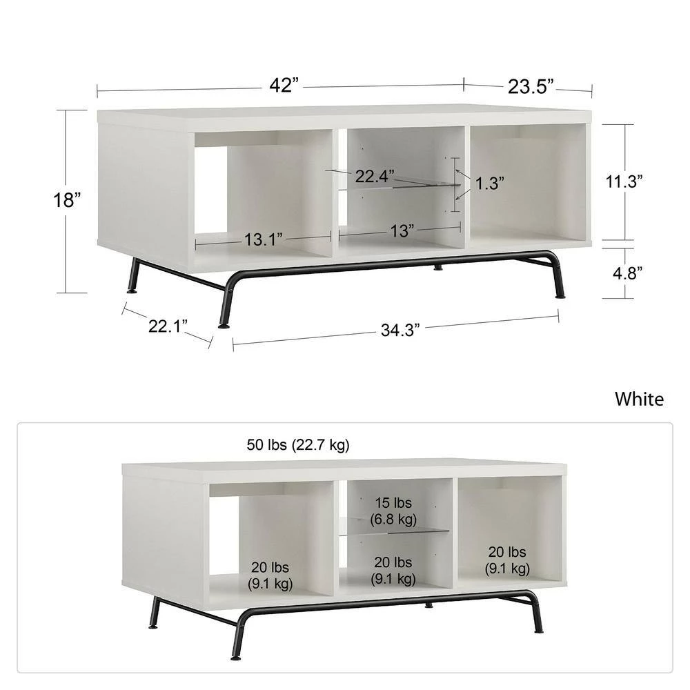 - The Table ships flat to your door and 2 adults are recommended to assemble. The table top can hold up to 50 lbs. while each shelf can hold 15 lbs. Assembled dimensions: 18″H x 42″W x 23.5″D