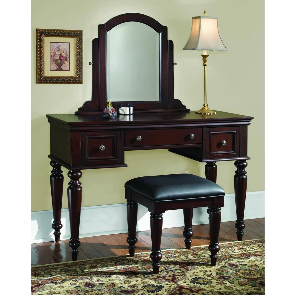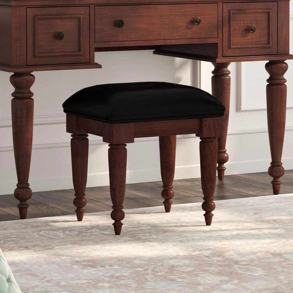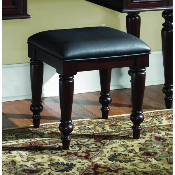 Pull up a seat and enjoy the view with this Homestyles Lafayette Vanity Bench. Whether used with the Lafayette vanity or on its own, this bench delivers padded comfort to the user and stylish elegance to the room. With a premium veneer and rock solid construction, this a truly timeless addition to your home that will last for years. The Lafayette Vanity Table Bench is finished in a cherry finish over mahogany solids with a black vinyl, cushioned seat and spindle legs. Size: 17 in. W x 15 in. D x 18.5 in. H.