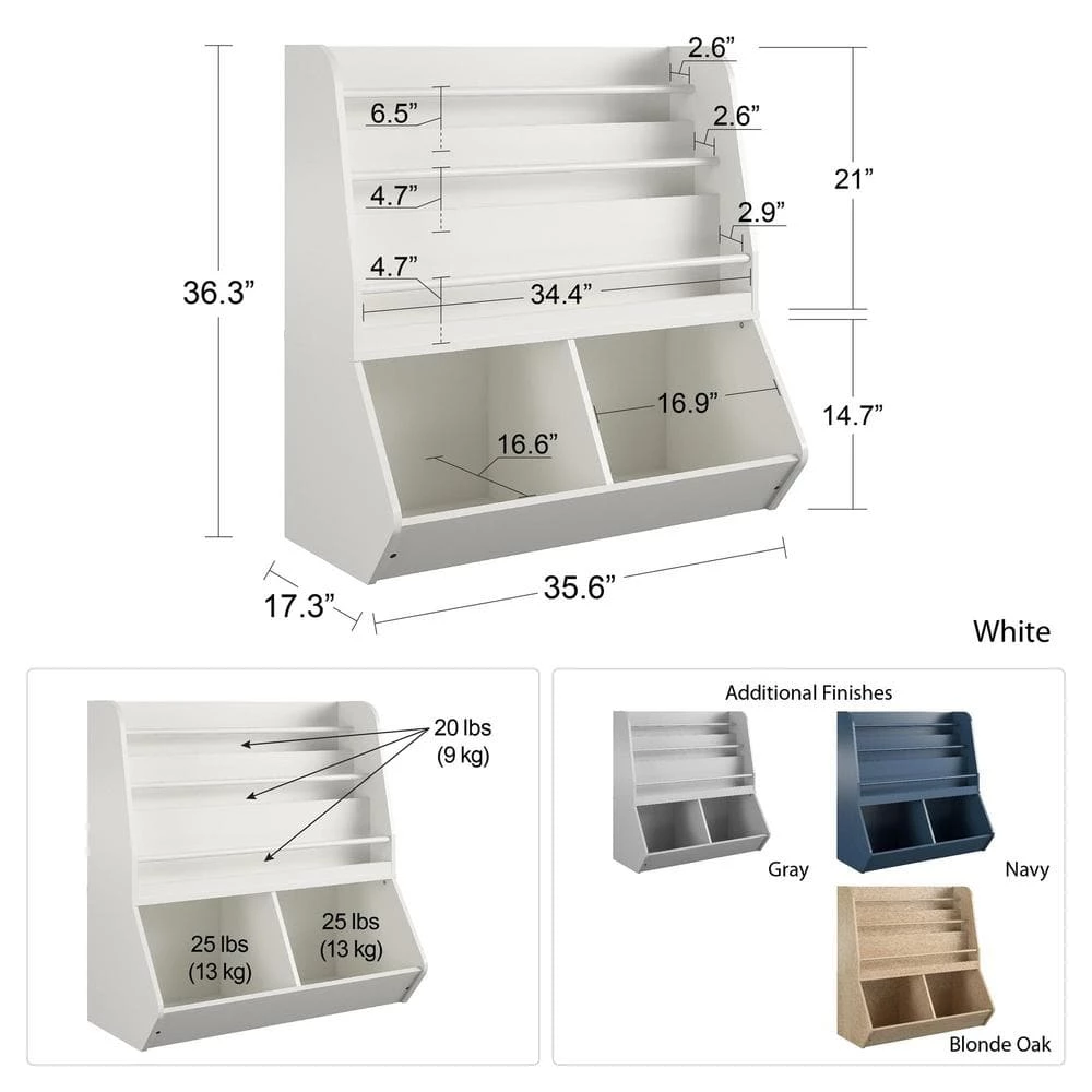 - The Toy Storage ships flat to your door and 2 adults are recommended to assemble. The 3 top shelves can hold up to 20 lbs. each. The lower 2 cubbies will hold 25 lbs. each. Assembled dimensions: 36.3″H x 35.6″W x 17.3″D.