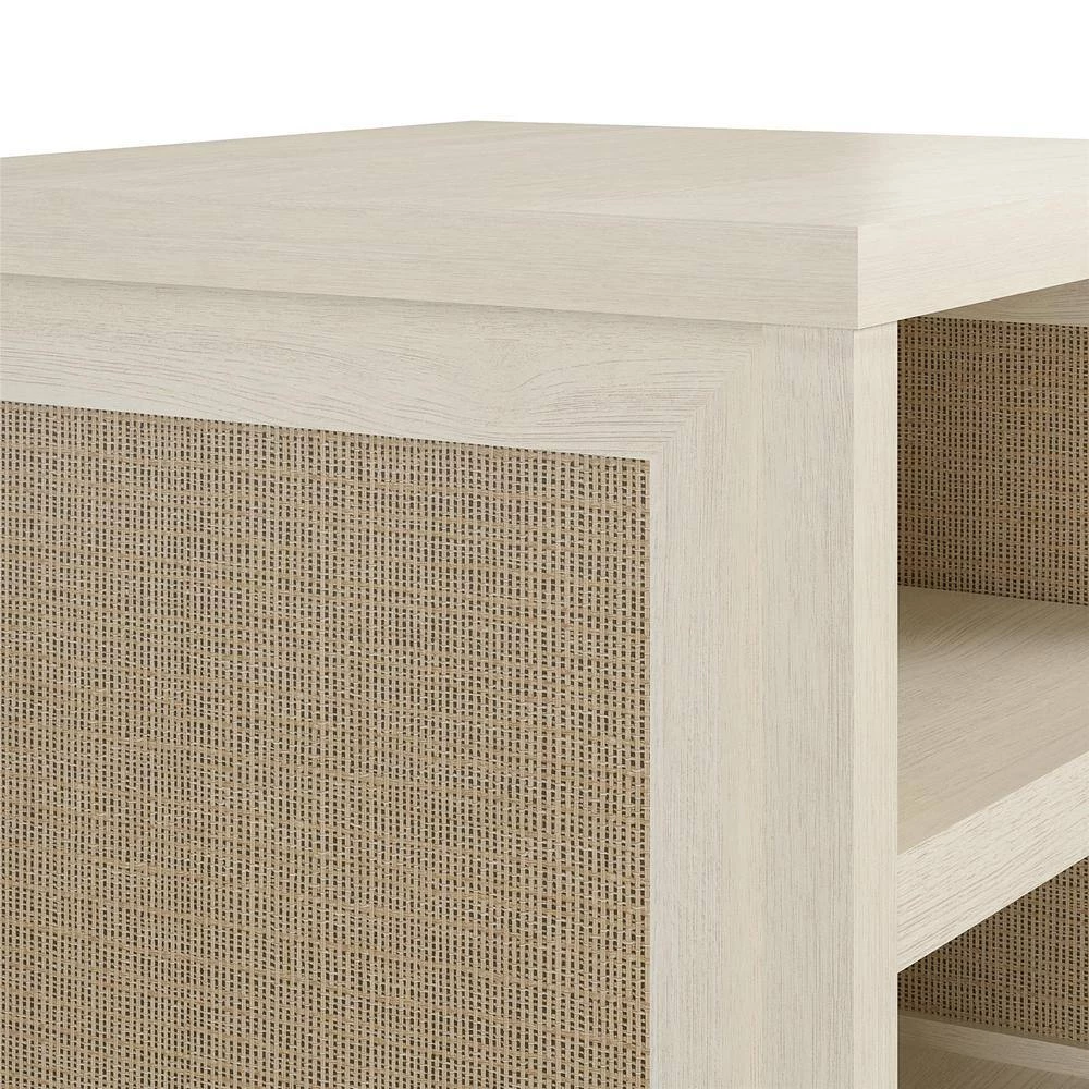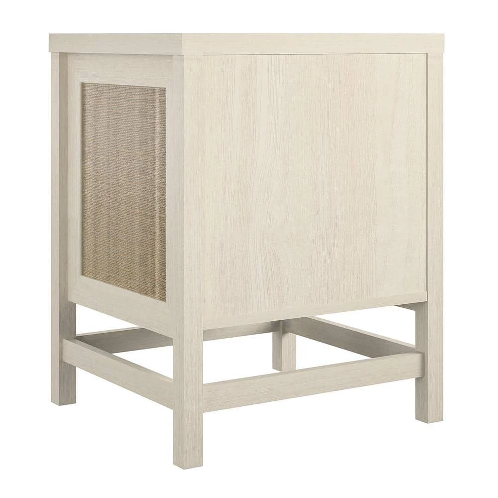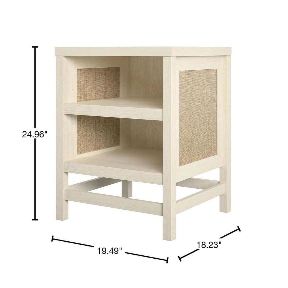 Give your living room a boho-chic upgrade with the Ameriwood Home Leeland End Table. The tabletop will keep remotes, snacks, and other move night essentials within reach. The 2 open shelves, 1 adjustable, are perfect for electronics and reading materials to keep your tabletop clutter-free. Made of laminated MDF and particleboard, the off-white woodgrain finish pairs with the faux rattan side panels for a fun coastal feel. Complete the look with the entire Leeland Collection (sold separately) The End Table ships flat to your door and requires assembly upon opening. Two adults are recommended to assemble. Once assembled, the End Table measures to be 24.96 in. H x 19.49 in. W x 18.23 in. D.