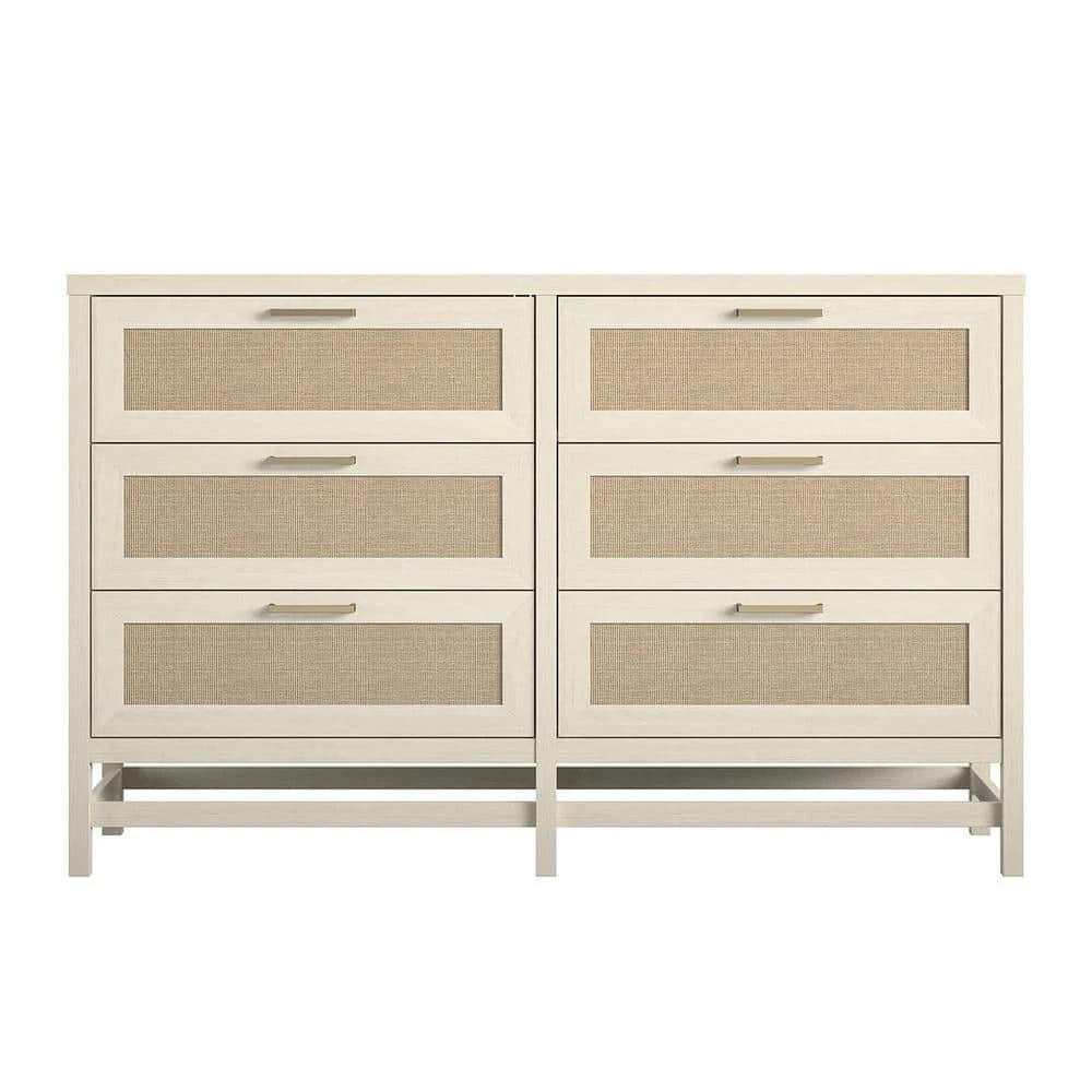 Clean up the clutter in your closet with the boho-chic Ameriwood Home Leeland 6 Drawer Dresser. The 6 drawers can store away t-shirts, socks, and jeans to free up space in your closet. Each drawer features durable metal slides for a smooth gliding drawer. Made of laminated MDF and particleboard, the off-white woodgrain finish pairs with the faux rattan drawer fronts for a fun coastal look. A wall anchor kit is included to secure the Dresser to the wall and prevent tipping injuries. The Dresser ships flat to your door and requires assembly upon opening. 2 adults are recommended to assemble. Once assembled, the Dresser measures to be 37.28″H x 59.37″W x 15.67″D.