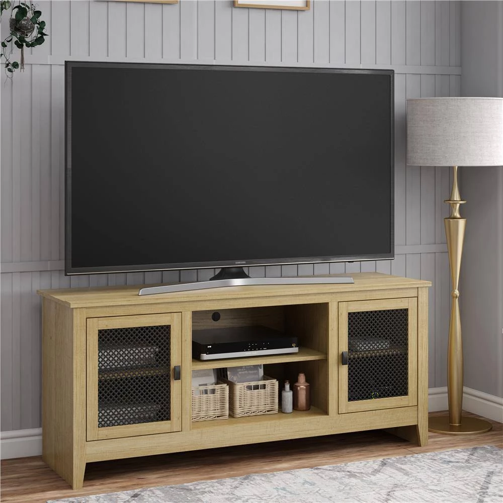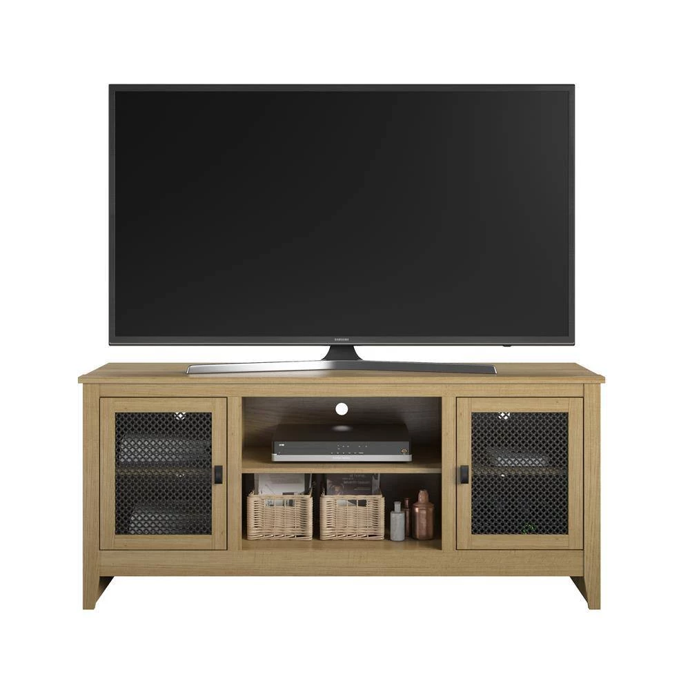 Give your living room a beautiful modern farmhouse look with the Ameriwood Home Luca TV Stand. This stylish TV Stand can accommodate most TVs up to 65″ wide or 120 lbs. The golden brown woodgrain finish on the laminated MDF and particleboard pairs with the metal mesh door inserts for a mix of rustic and modern styles. The center shelves are perfect to house your cable box, DVD or Blu-Ray player, and audio equipment and offers an adjustable shelf to accommodate equipment of different sizes. The 2 side cabinets feature doors with metal mesh inserts for an industrial touch and conceal an adjustable and fixed shelf behind each door. The wire management holes in the back panels make plugging devices in simple and keep your cords tangle free. The TV Stand ships flat to your door and requires assembly upon opening. Two adults are recommended to assemble. Once assembled, the TV Stand measures to be 26.5″H x 59.8″W x 17.7″D.