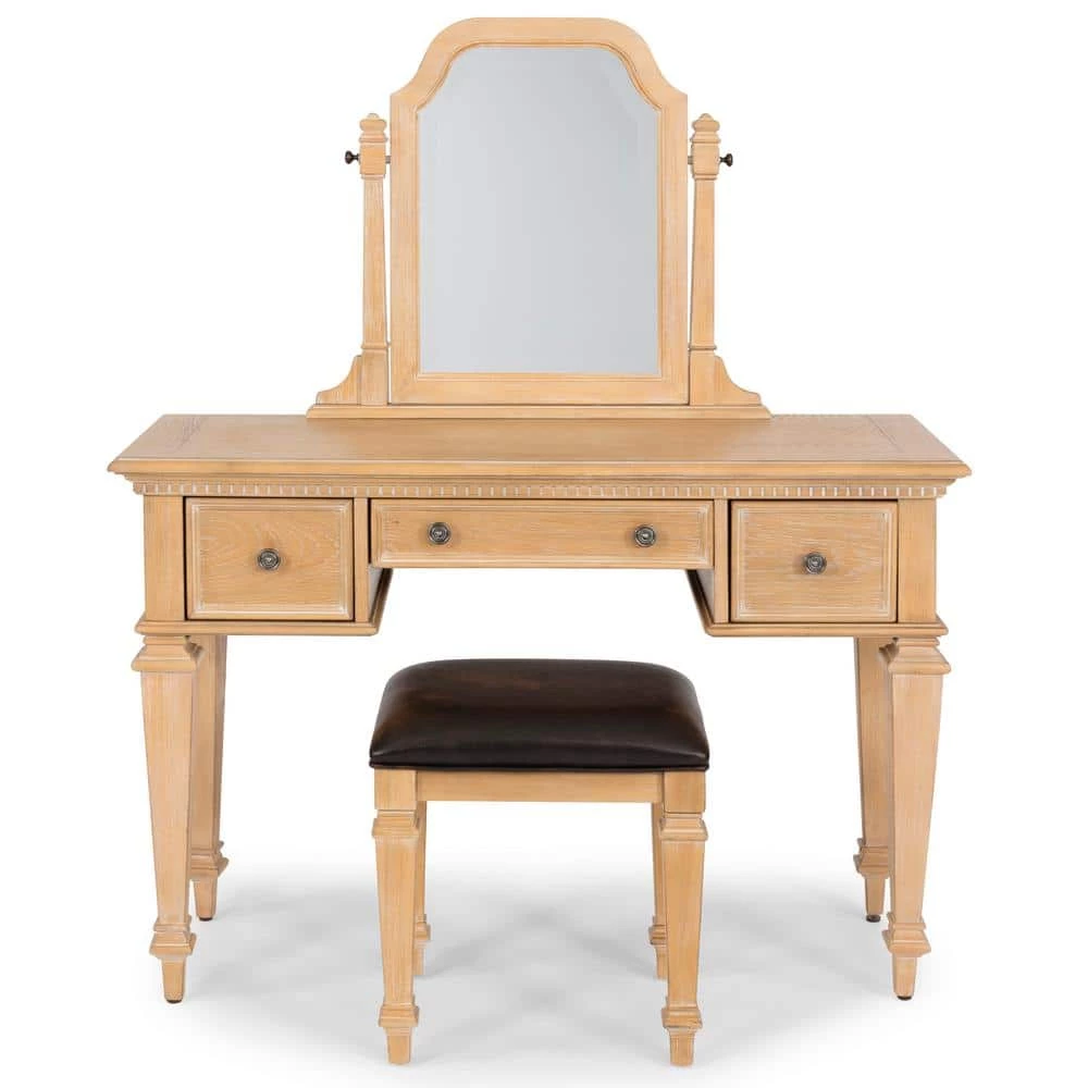 Traditional design in an updated contemporary aged waxed white oak finish. Crafted from wire brushed hardwood solids and white oak veneers, over engineered woods. Vanity features carved, turned legs both front and back. Piano molding under the top adds to traditional design, with white, dry brush finish, creating a waxed hang-up look. The top and drawer fronts feature cathedral grain white oak veneer, with the side panels using straight grain white oak veneer. 3-drawers, with outer edge, picture frame molding, with antique nickel drawer pulls. Lap drawer has a felt lined bottom, to help protect more delicate items. 2-outside drawers feature felt lined, removable, jewelry holders. Mirror features beveled glass and swivels for adjustment. Bench is crafted from wire brushed hardwood solids. Padded upholstered top is covered in brown leather and features a welt edge all the way around. Note finish and measurements may vary slightly. Assembly required. Arrives to your door by parcel delivery service. Vanity: W-49 ¾ in., D-18 in., H-54 ½ in.; Bench: W-17 in., D-14 ¾ in., H-18 in.