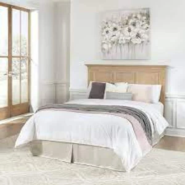 Traditional design in an updated contemporary aged waxed white oak finish. Crafted from wire brushed hardwood solids and white oak veneers, over engineered woods. Headboard features piano molding under the solid wood molded top, with 3-framed panels of cathedral grain white oak veneer. Can be attached to most metal bed frames, hardware not included. Note finish and measurements may vary slightly. Assembly required. Arrives to your door by parcel delivery service.