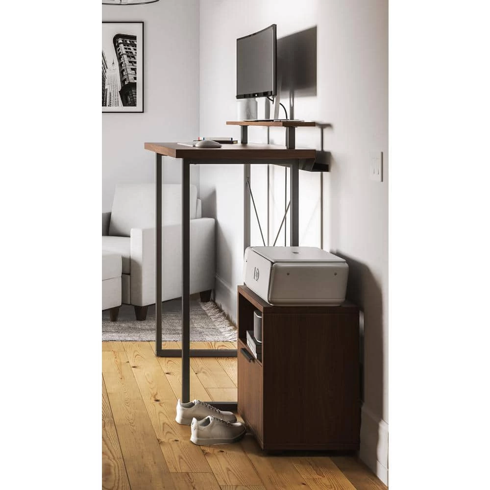 - Set includes a standing height table desk with monitor stand and a storage pedestal