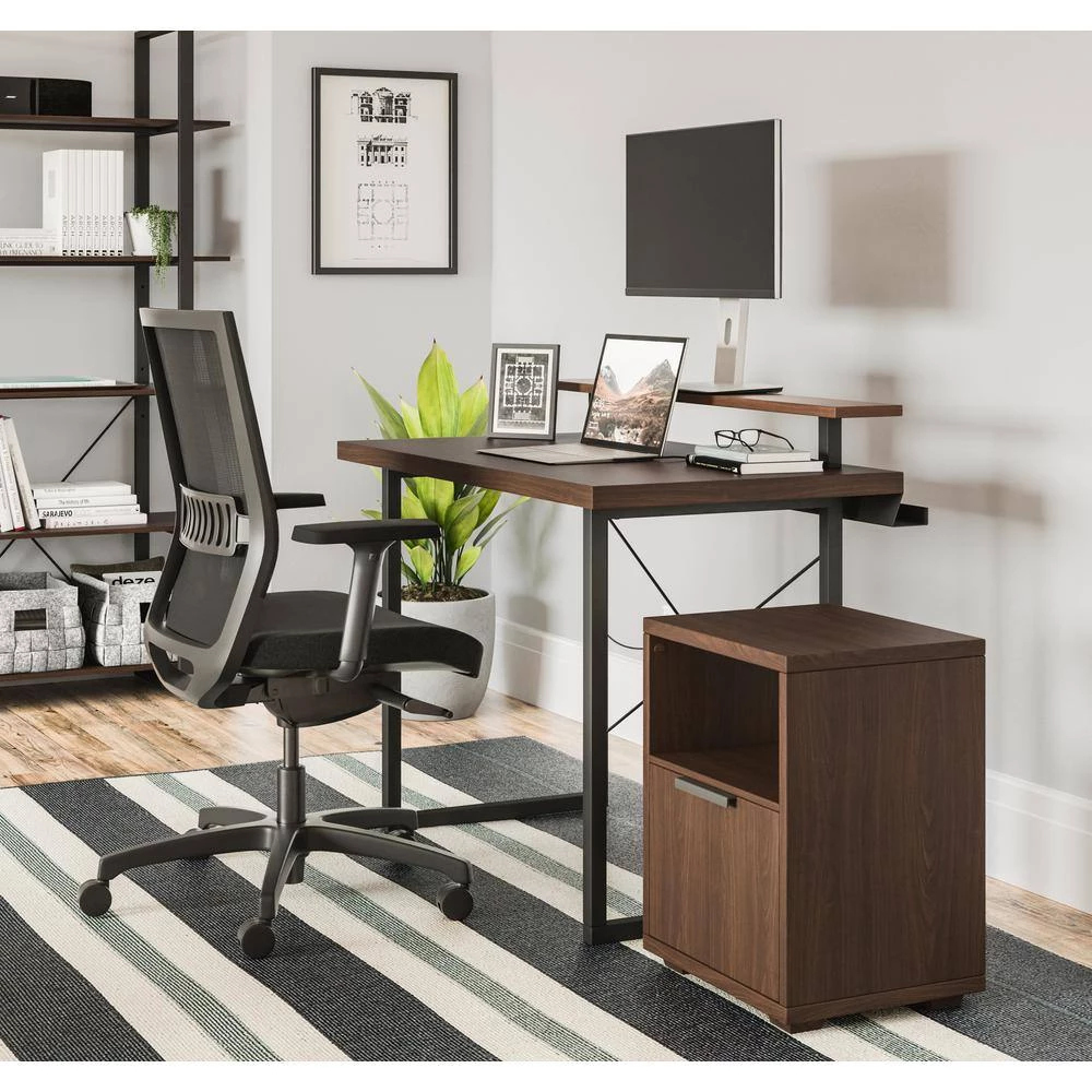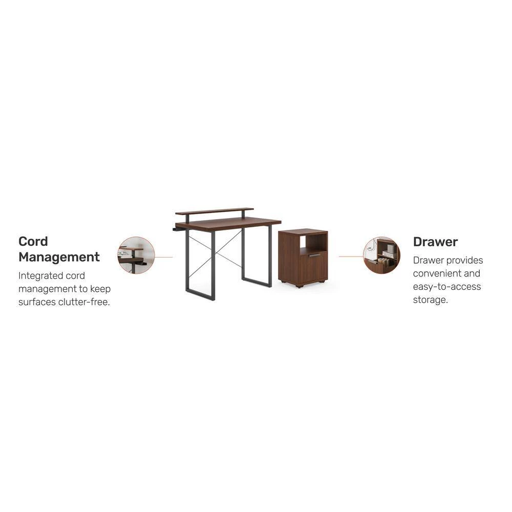 From collaborative areas to home offices, there isn’t a workspace that wouldn’t benefit from this Homestyles Merge Table Desk with Monitor Stand and Storage Pedestal. This 2-piece set brings a whole new level of functionality and style to your workspace, with a light scale frame that supports a walnut veneer top with a second platform to hold a flat screen monitor. Throw in a handy storage pedestal, and it’s time to get down to work. The lacquer top coat protects the finish and creates totally worry-free ownership.
