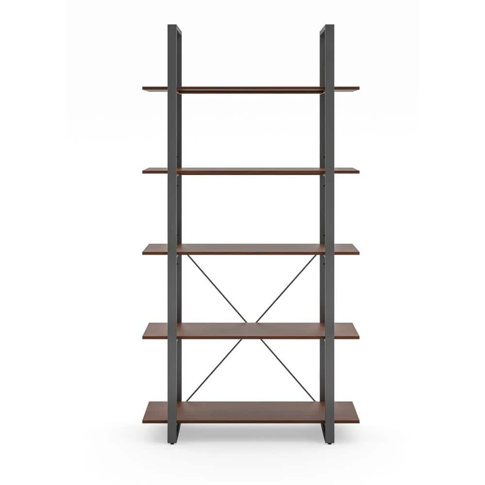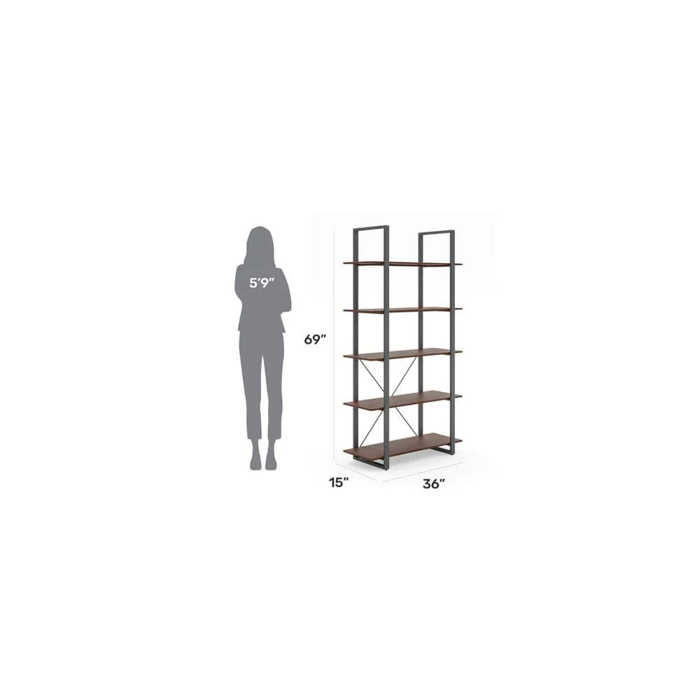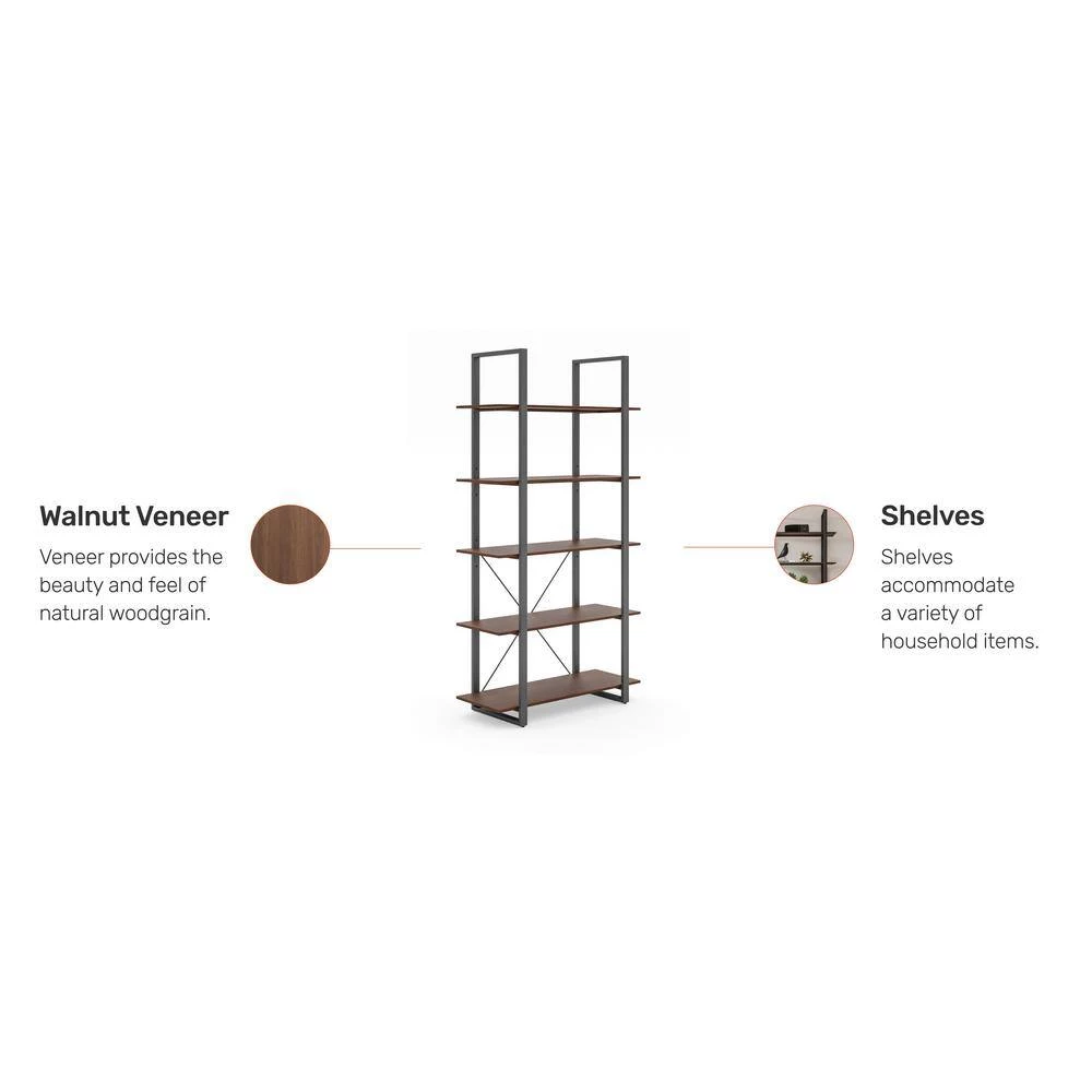 Organize books or showcase valuables with this Homestyles Merge Five-Shelf Bookcase. Whether used in an office setting, living room or bedroom. this vertical storage solution is ideal for smaller spaces. The light scale frame gives it a minimalist appeal, which accentuates the warm walnut veneer. The lacquer top coat protects the finish and creates totally worry-free ownership.