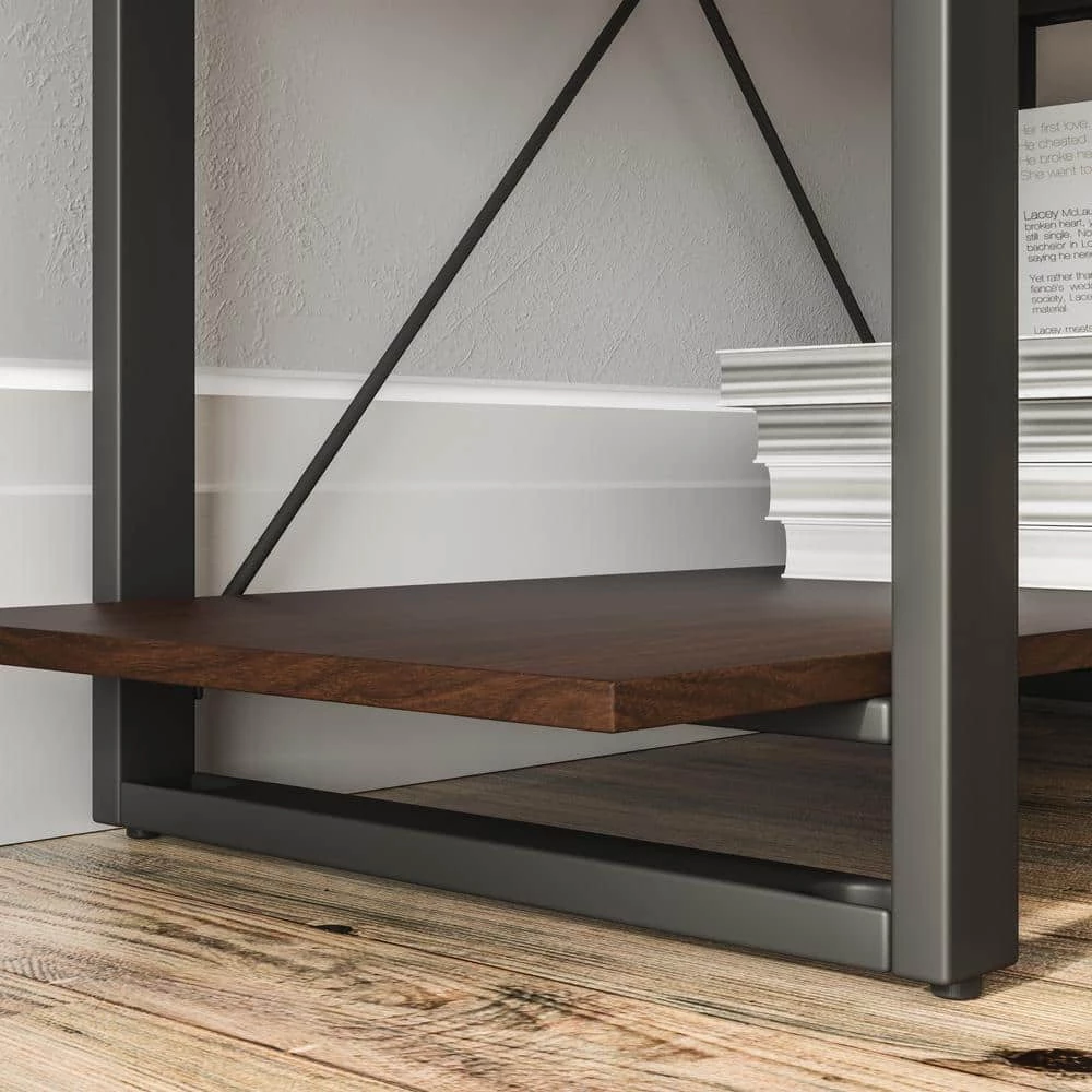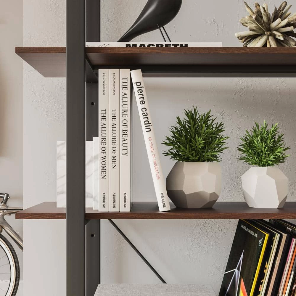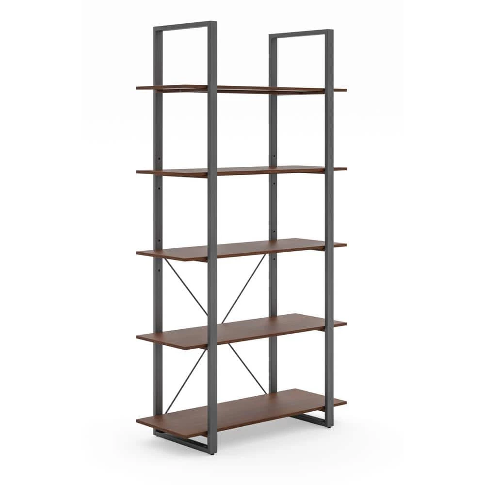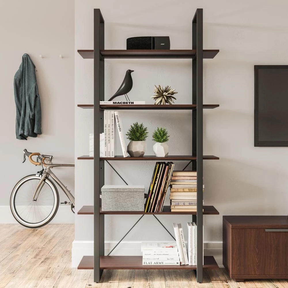 Organize books or showcase valuables with this Homestyles Merge Five-Shelf Bookcase. Whether used in an office setting, living room or bedroom. this vertical storage solution is ideal for smaller spaces. The light scale frame gives it a minimalist appeal, which accentuates the warm walnut veneer. The lacquer top coat protects the finish and creates totally worry-free ownership.