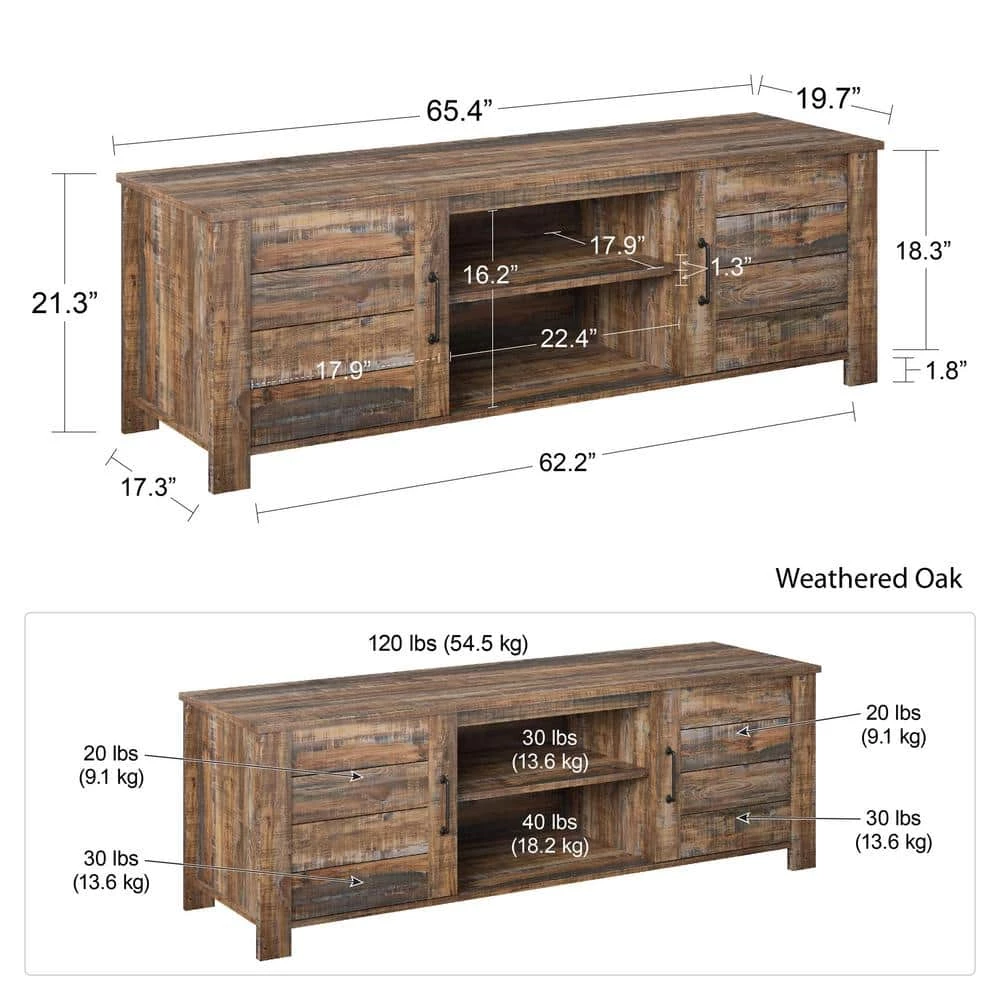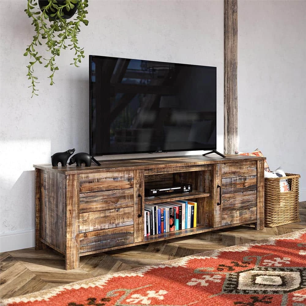 Your guests will love the old rustic look of the Ameriwood Home Mescal TV Stand. This TV Stand holds up to a 70 in. flat panel TV with a maximum weight of 120 lbs. Inspired by the weathered look of an old barn, this TV stand is full of character and brings a unique style element to your space. Made from laminated particleboard, the rustic brown woodgrain finish gives this TV stand its worn appearance, but don’t worry – this incredible piece of furniture is designed to last. Take advantage of various open compartments and closed storage to keep all of your media essentials like your DVD player, cable box and video game systems organized. The Mescal TV Stand ships flat to your door and requires assembly upon opening. Two adults recommended for assembly. After assembly, the TV Stand measures to be 21.34 in. H x 65.35 in. W x 19.69 in. D.