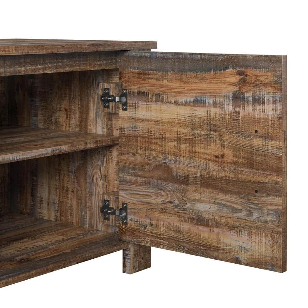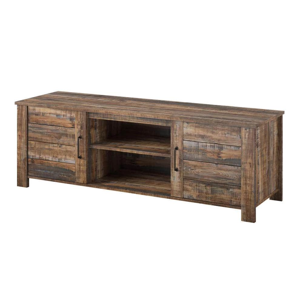 - Made from laminated particleboard and finished with a rustic brown woodgrain finish, this TV stand is inspired by the weathered look of an old barn