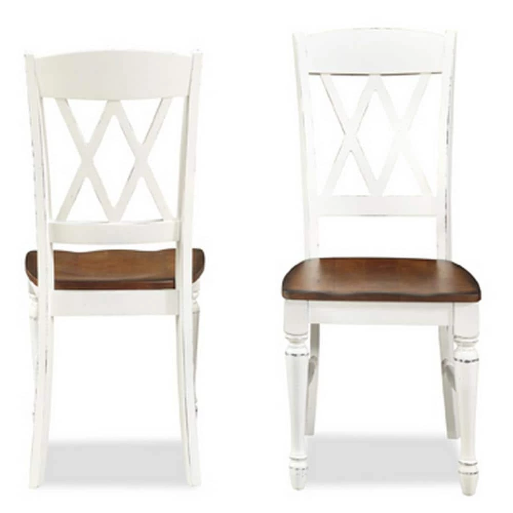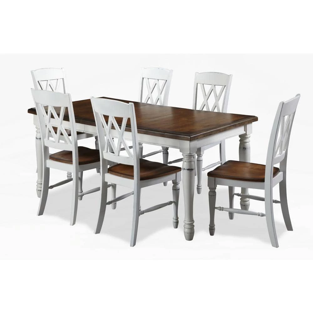 The Monarch Rectangular Dining Table and 6-Double X-back Chairs by Home Styles blends upscale design with functionality. This stylish dining set blends hardwood solids, engineered wood, and veneers with an affluent, rubbed off-white and 9-step distressed oak finish. The Monarch Dining Table and Chairs projects striking style with sophisticated solid wood turned legs with intricate carved detail. Perfect for any dining room large or small equipped with an 18 removable leaf. Size: 48.25 in. W x 36 in. D x 30.25 in. H. extends to 66 in. wide with leaf. The Monarch Dining chairs are packed 2 per carton. Size: 20.75 in. W x 17.75 in. D x 38 in. H. Set includes rectangle dining table, 6-double x-back chairs. Assembly required.