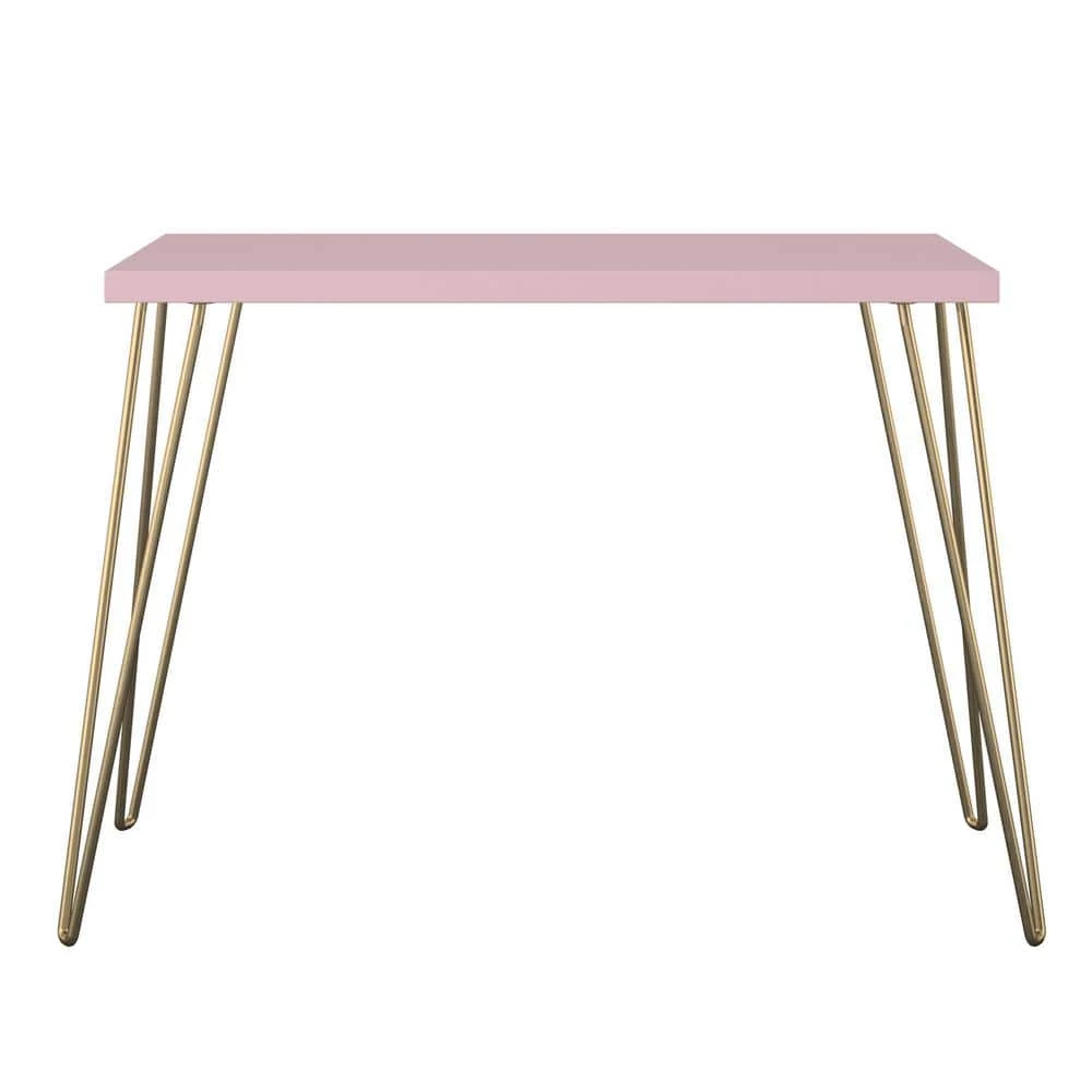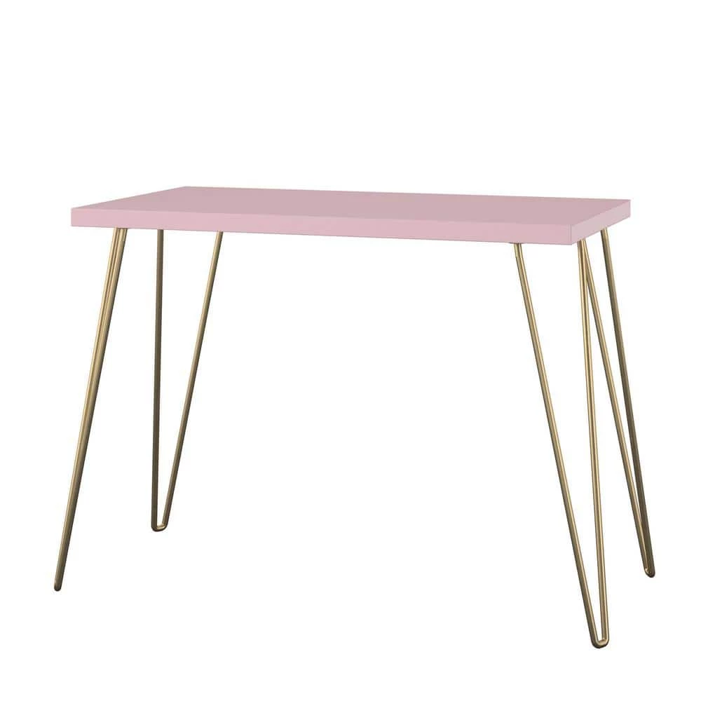 Create work from home space in small and medium-sized rooms with the Ameriwood Home Montrose Retro Computer Desk. Make the most of this piece’s versatility by using it as a desk, vanity or console table in the office, den, or living room. Able to support up to 100 lbs., it’s great for holding your laptop, important paperwork, desk lamp and family photos. The light pink finish coupled with the gold metal hairpin-style legs adds an updated, modern look. The Desk ships flat to your door and minimal assembly is required. Simply attach the 4 legs to start using your Desk. Once assembled, the Desk measures to be 29.2 in. H x 40 in. W x 19.5 in. D.