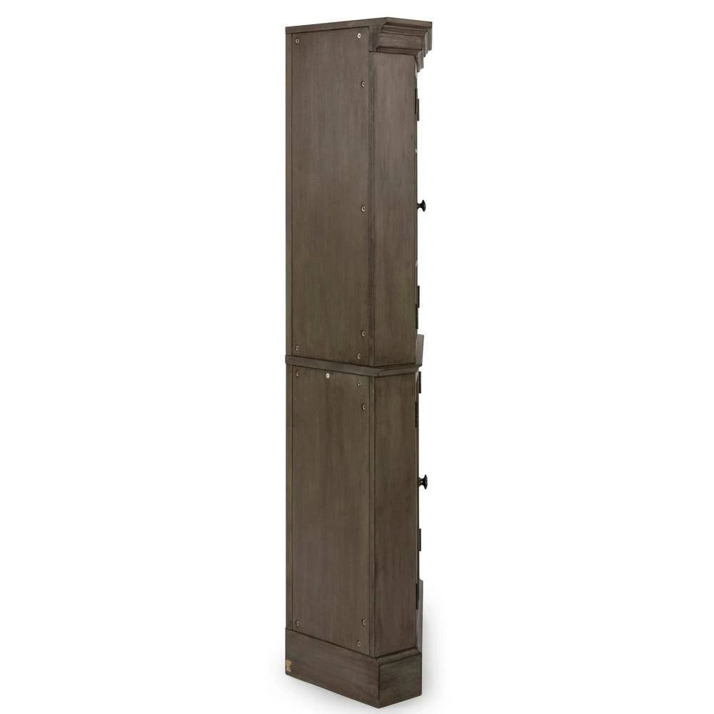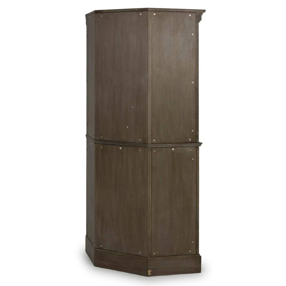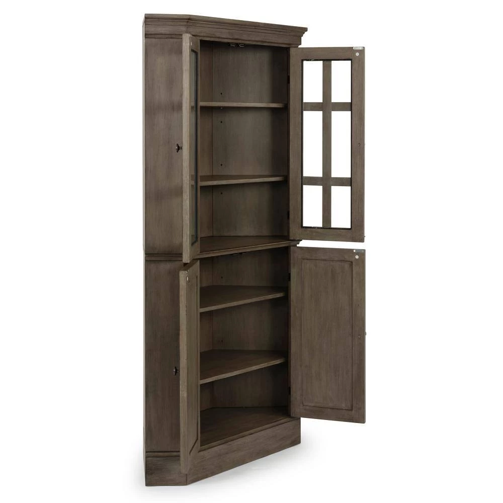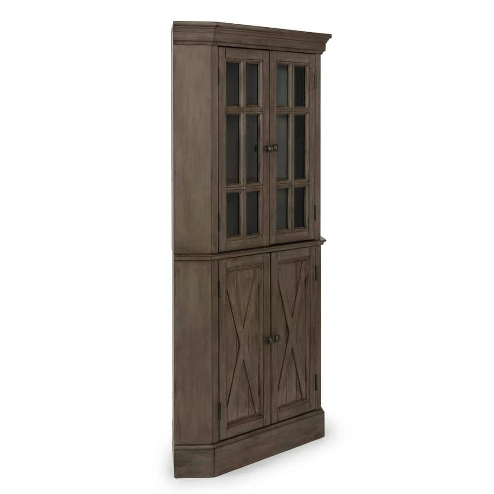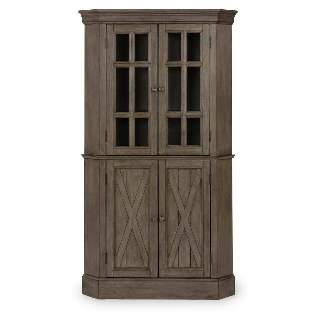Rustic casual design that is at home in a mountain lodge, as it is in a mid-town loft. Crafted of poplar solids and hardwood veneers with engineered woods, that features solid wood X frame design, with inset wainscot panels, with all surfaces wired brushed to provide a rough-hewn look. Finished in a multi-colored gray that provides unique high lighting to the design. Two upper doors feature tempered glass with outer work molding, and open to two adjustable shelves. Lower doors open to two adjustable shelves Door pulls are antiqued nickel finished. Arrives to your door by parcel delivery service. Note finish and measurements may vary, assembly required. W-40 , D-16 , H-72.