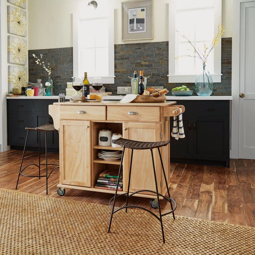 Practicality meets luxury when you spice up your kitchen with this Homestyles General Line Kitchen Cart. The solid hardwood and engineered wood frame features a natural finish and all the bells and whistles a kitchen needs. Drawers and cabinets and open shelves…oh my! Stay in control of your storage and keep commonly used things within reach with this multipurpose addition to your kitchen. Size:49.75w 24d 35h