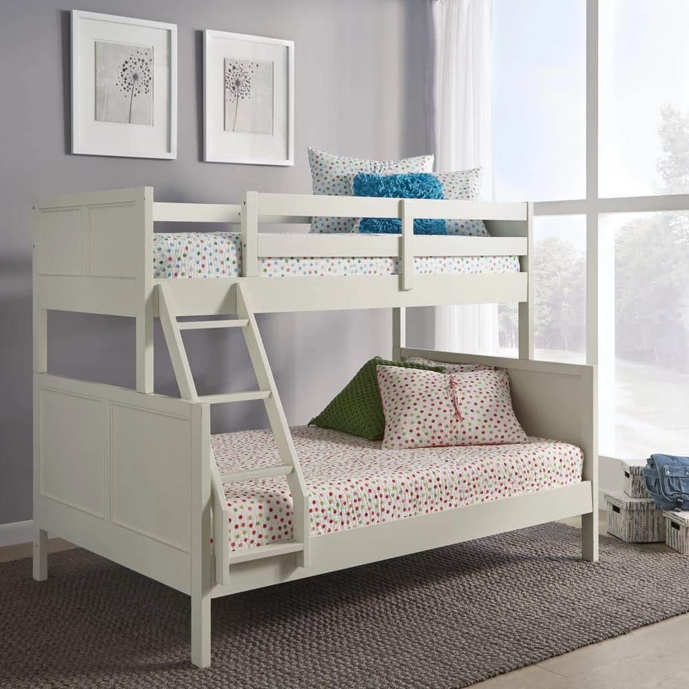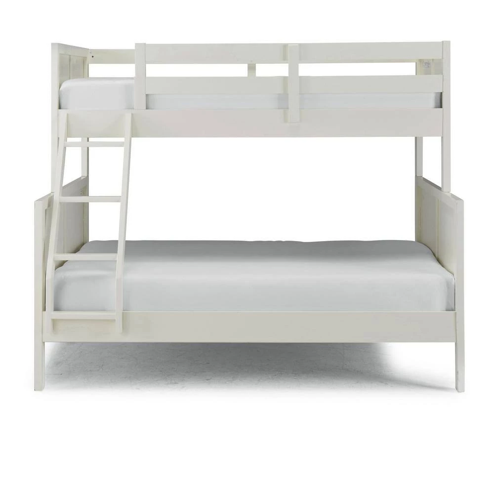 Transitional design that works in any decor. Crafted of solid hardwoods, laminated veneer lumber and engineered woods, finished in an off-white satin painted finish. Laminated veneer lumber is a construction grade product used to make beams for framing and is stronger and more durable than solid wood. It is used in key areas for added strength and safety. Bed includes angled side ladder that attached to the lower and upper side rails for easy access to top bunk and includes slates for mattress support. Lower bunk is sized for standard, full size mattress and the upper bunk for twin size mattress, mattresses not included. Duel frame paneled headboard and footboard for added design element with dual rail upper bunk side protection for safety and stability. Note finish and measurements may vary slightly, assembly required. W-78 , D-58 , H-64.