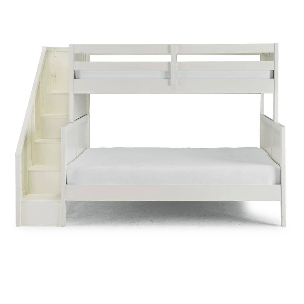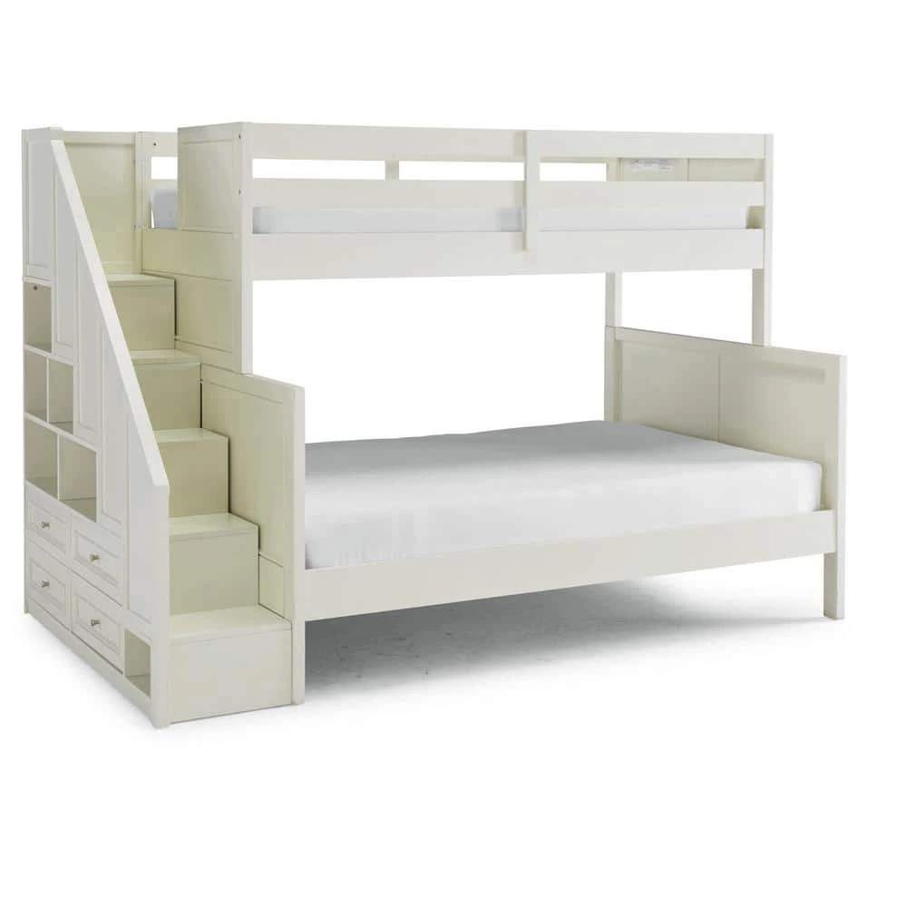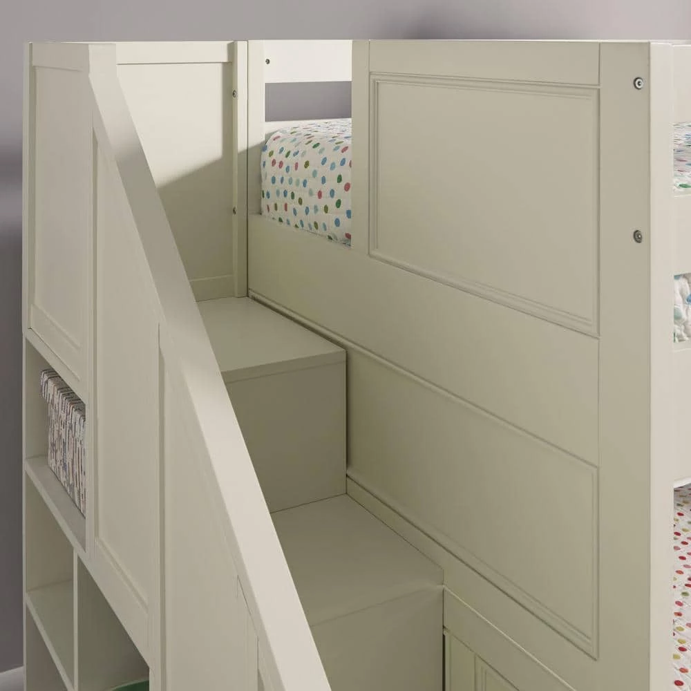 Transitional design that works in any decor. Crafted of solid hardwoods, laminated veneer lumber and engineered woods, finished in an off-white satin painted finish. Laminated veneer lumber is a construction grade product used to make beams for framing and is stronger and more durable than solid wood. It is used in key areas for added strength and safety. Bed includes end of bed steps for the safest possible access to the top bunk and includes 4 lower drawers and 6 cubicles for added storage. Solid side panels with a top banister for additional safety. Both bunk areas include slates for mattress support. Lower bunk is sized for standard, full size mattress and the upper bunk for twin size mattress, mattresses not included. Duel frame paneled headboard and footboard for added design element with dual rail upper bunk side protection for safety and stability. Note finish and measurements may vary slightly, assembly required. W-94 , D-57, H-64.