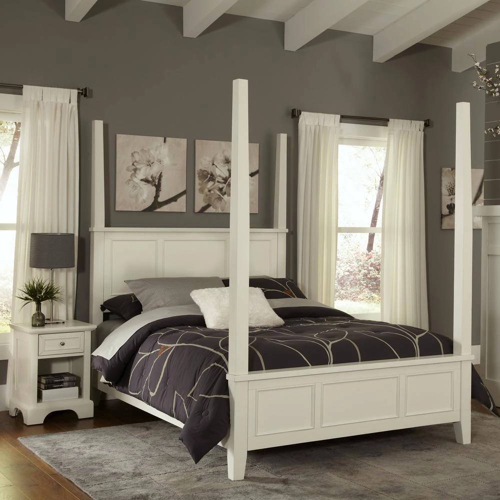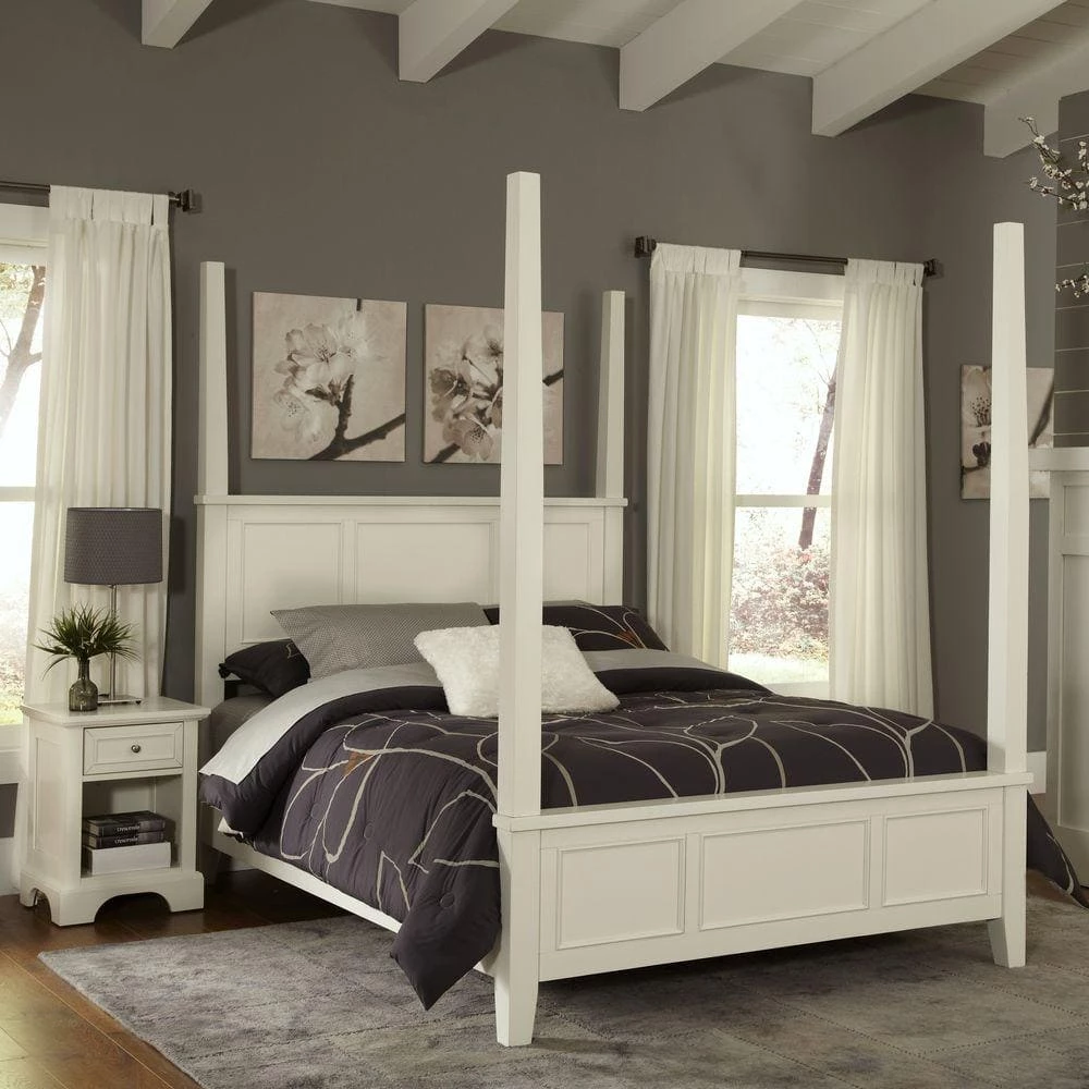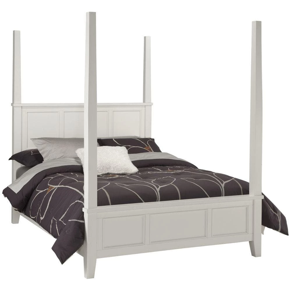 Unadorned details such as the straight and curved lines, and slightly flared legs create the contemporary style of the Naples Queen Poster Bed by Home Styles. Bed is constructed of hardwood solids and engineered wood in a smooth, white finish. Other features include raised panels on the headboard and footboard. Size: 63.5 in. W x 88 in. D x 80 in. H.