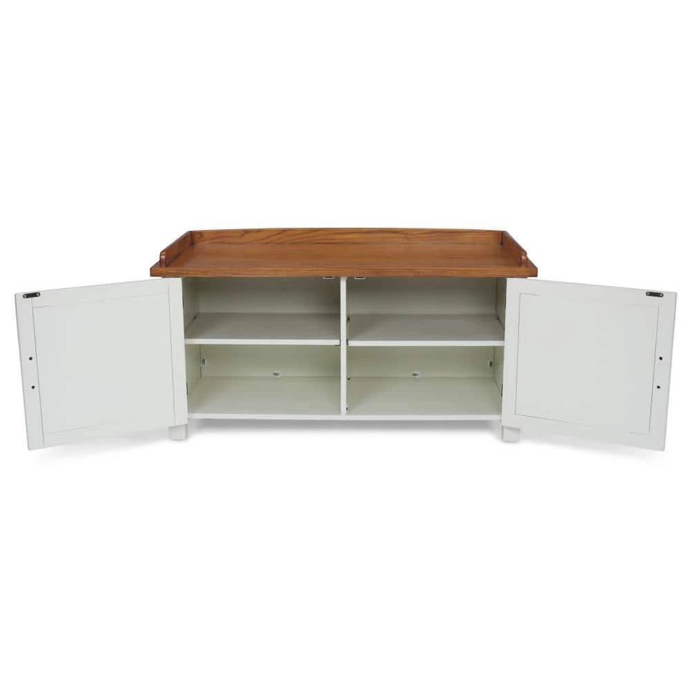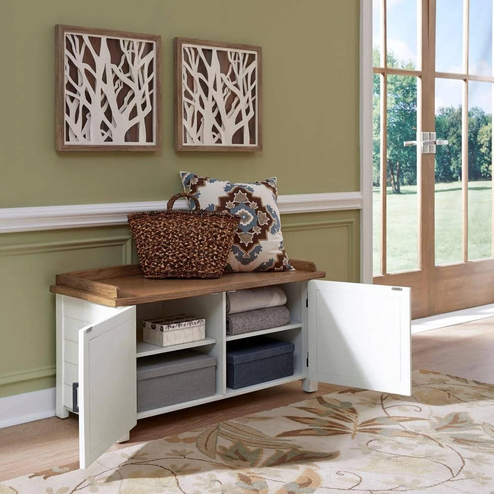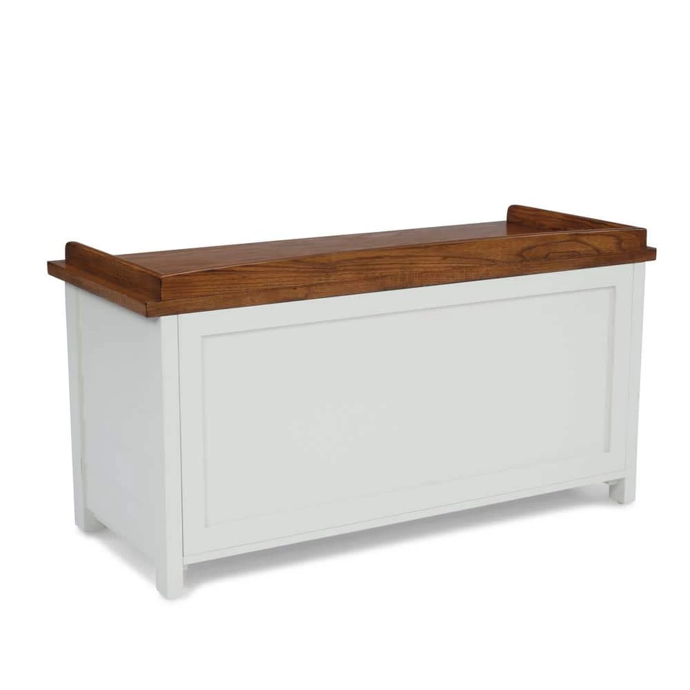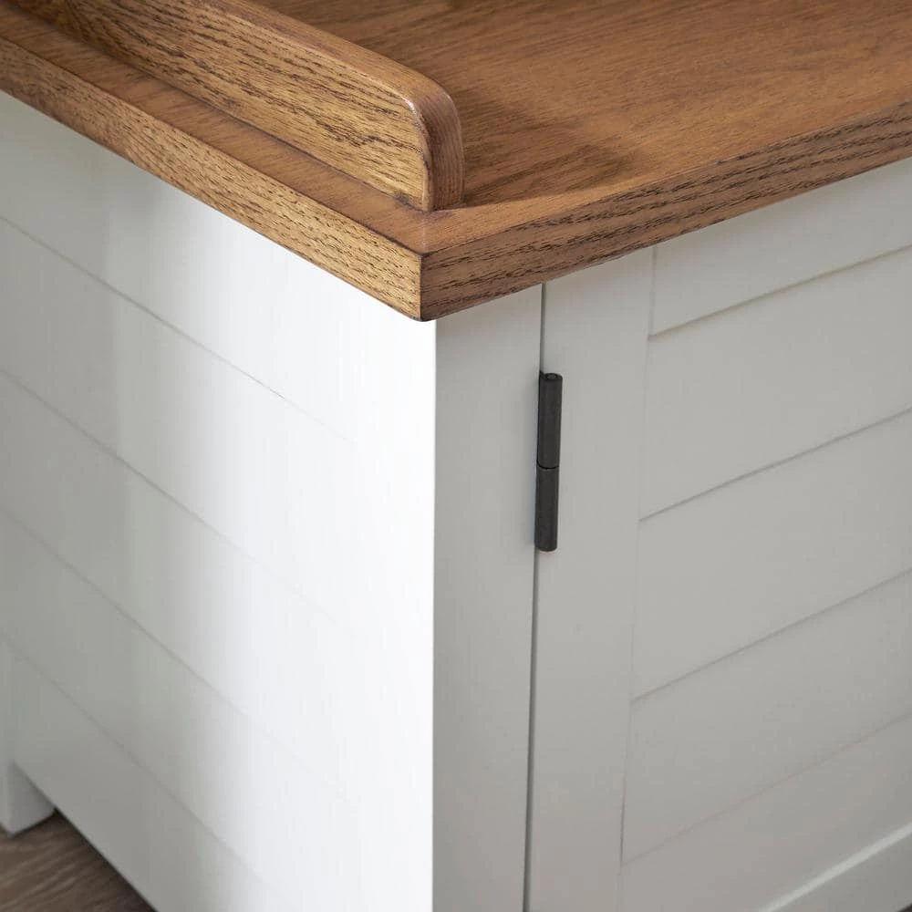 Classic coastal New England styling with shiplap look panels. Crafted from poplar solids and oak veneer, with engineered wood. Off white painted finished with brown oak stained top. The top features solid oak raised edge molding, both on the sides and the back. 2-lower doors that open to 2-individual storage areas. Each features an adjustable shelf. The vertical panel that separates the 2-storage area is there to add support to the seat and allows the doors to open, even when someone is seated on it. Note finish and measurements may vary slightly. Assembly required. Arrives to your door by parcel delivery service. 42 in. W x 18 in. D x 22 ½ in. H.