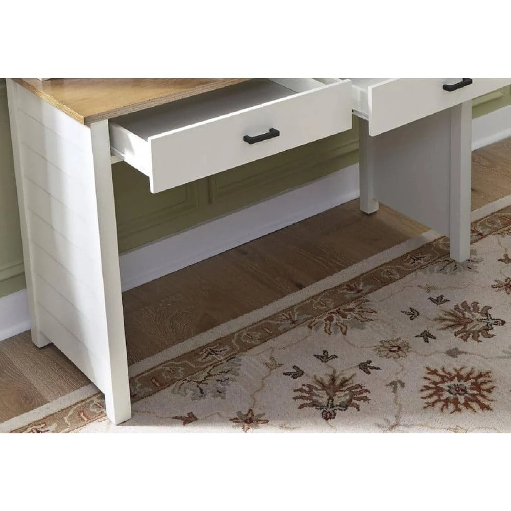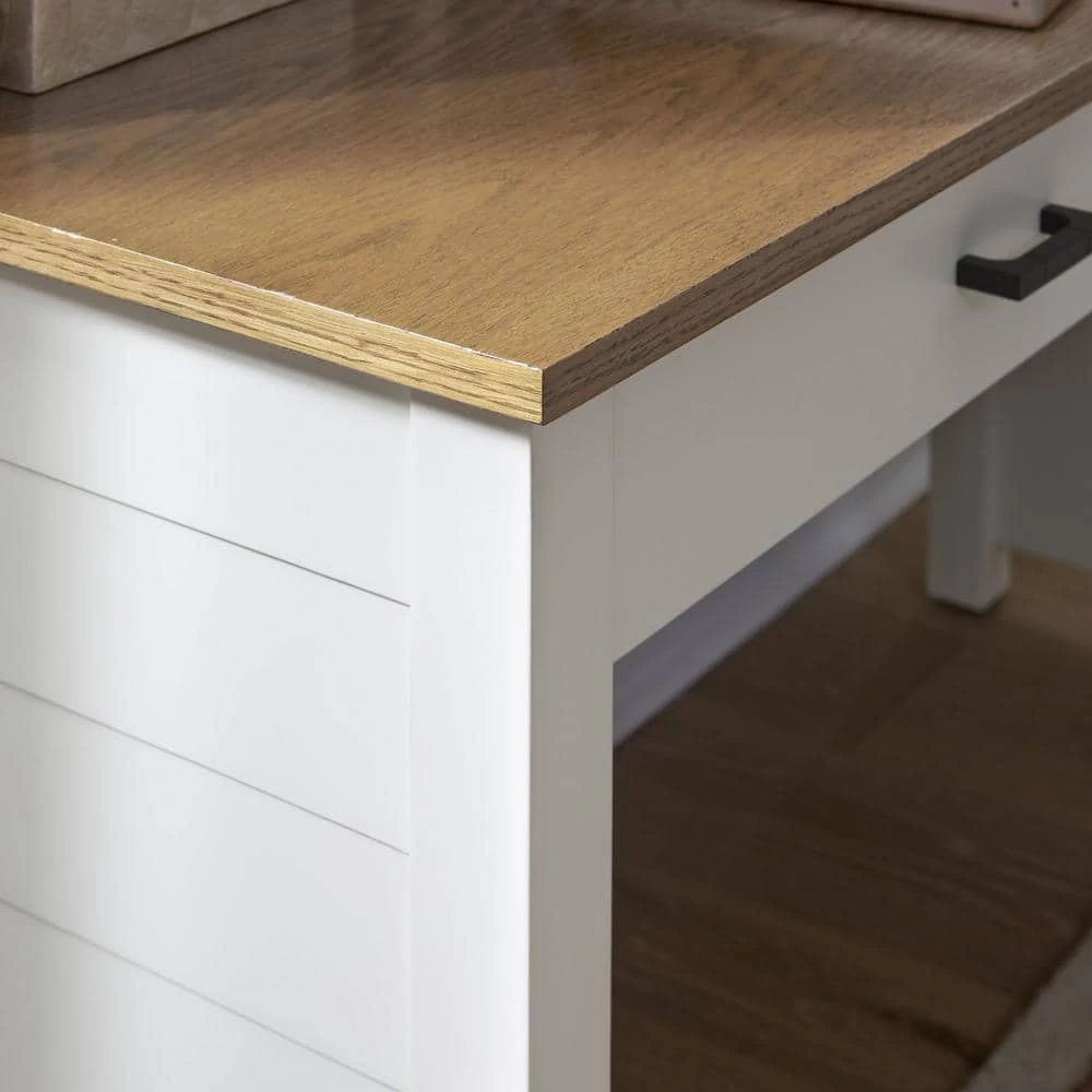 Classic coastal New England styling with shiplap look panels. Crafted from poplar solids and an oak veneer top with engineered wood. Off white painted finished with brown oak stained top. The oak veneer top provides a generous work surface with 2-lower storage drawers, with metal drawer pulls, finished in aged antiqued nickel. Side panels are framed and feature the shiplap look panels. Note finish and measurements may vary slightly. Assembly required. Arrives to your door by parcel delivery service. 54 in. W x 22 in. D x 30 in. H.