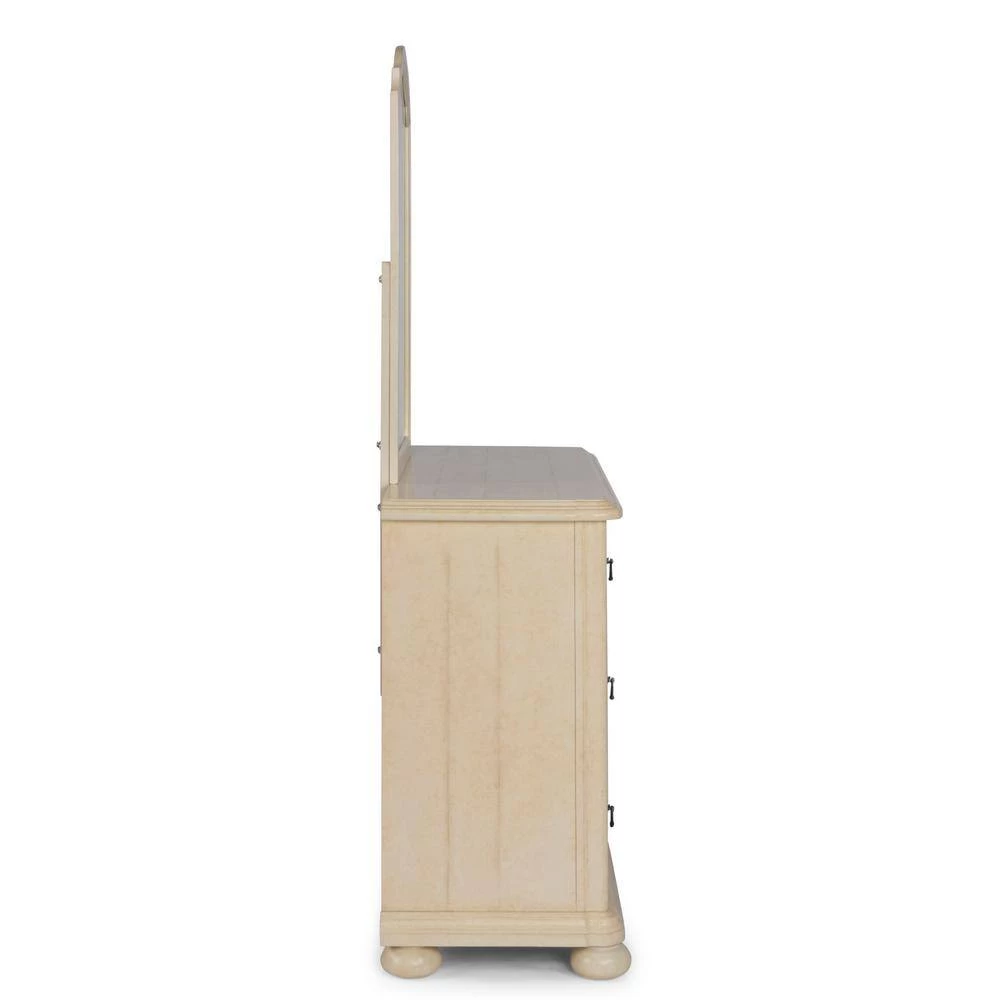 Find French farm-house charm in this Provence Dresser with Mirror by homestyles. Crafted of hardwood solids and mahogany veneers with engineered wood. A hand-applied, aged, off-white painted parchment finish and plank top and side panels add character. The top also features a shaped, multi-tier edge, as does the base molding. Six drawers feature detail molding and aged nickel-finished ring style drawer pulls. The top two drawers feature a felt bottom to protect more delicate clothing items. The design is completed with four bun feet. The mirror features a carved, beveled inner edge and carved shaped top, with shaped beveled edge mirror glass. Comes with mounting brackets to attach to the dresser or attachments to allow hanging on the wall. Arrives at your door by parcel delivery service. Finish and measurements may vary. Assembly required. Dresser: 36″H x 54″W x 19″D. Mirror: 38″H x 28″W x.75″D.